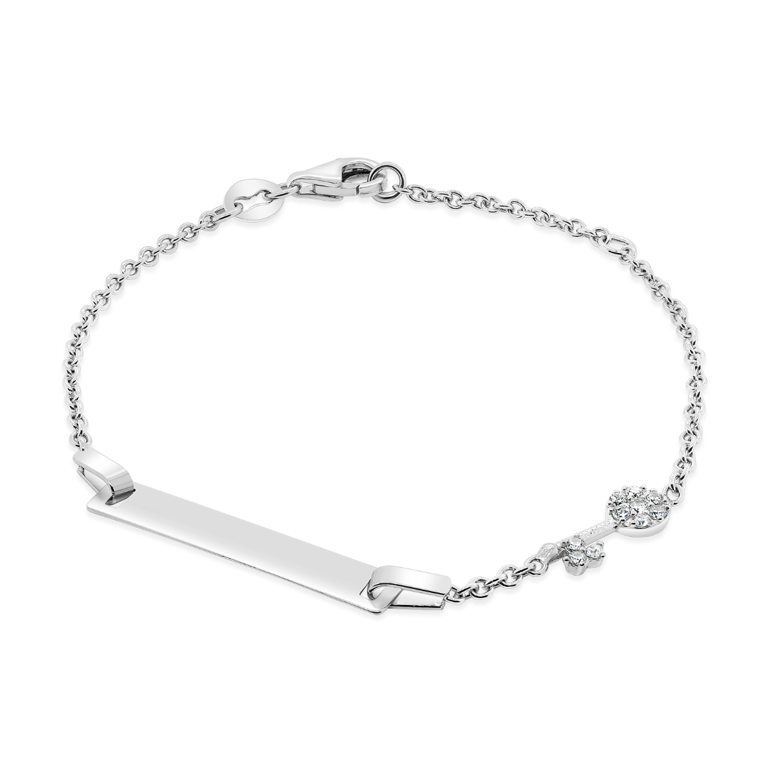 Brățară aur alb de 14K, reglabilă cu pietre Cubic Zirconia albe și plăcuță personalizabilă prin gravură.