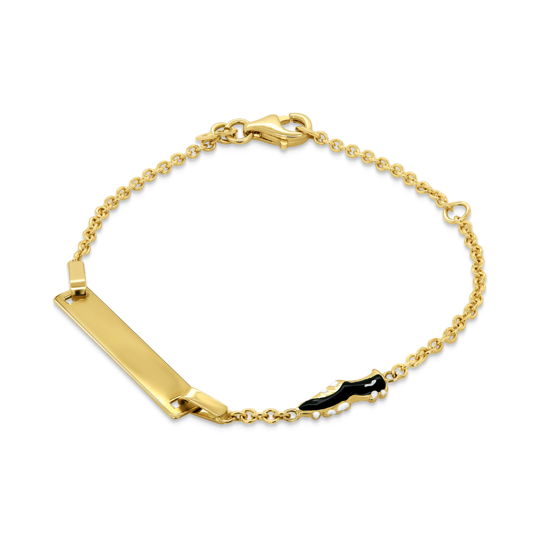 Brățară pentru băieți din aur galben de 14K, cu plăcuță personalizabilă prin gravare și ghetuță de fotbal cu email.