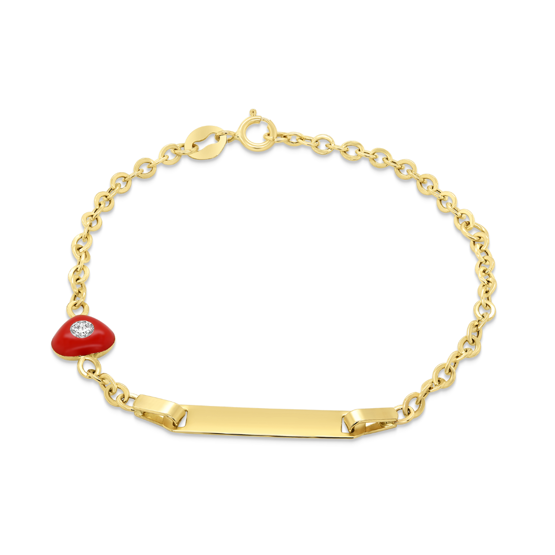 Brățară din aur galben de 14K cu element tip inimioară cu Email și plăcuță personalizabilă prin gravare.