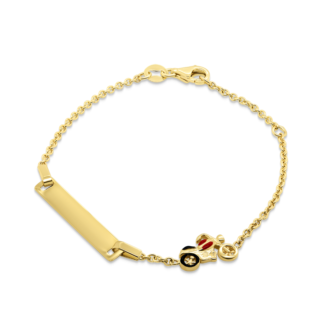 Brățară din aur galben de 14K reglabilă, cu element tip motocicletă și plăcută. Aceasta poate fi personalizata prin gravare.