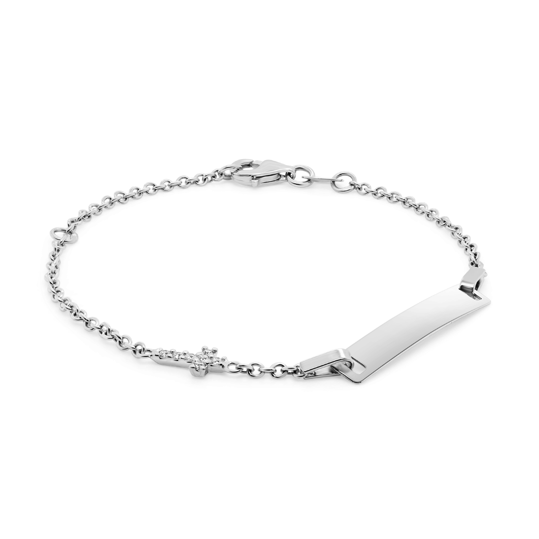 Brățară din aur alb de 14K pentru copii, cu plăcuță și pandantiv cruce cu pietre cubic zirconia.