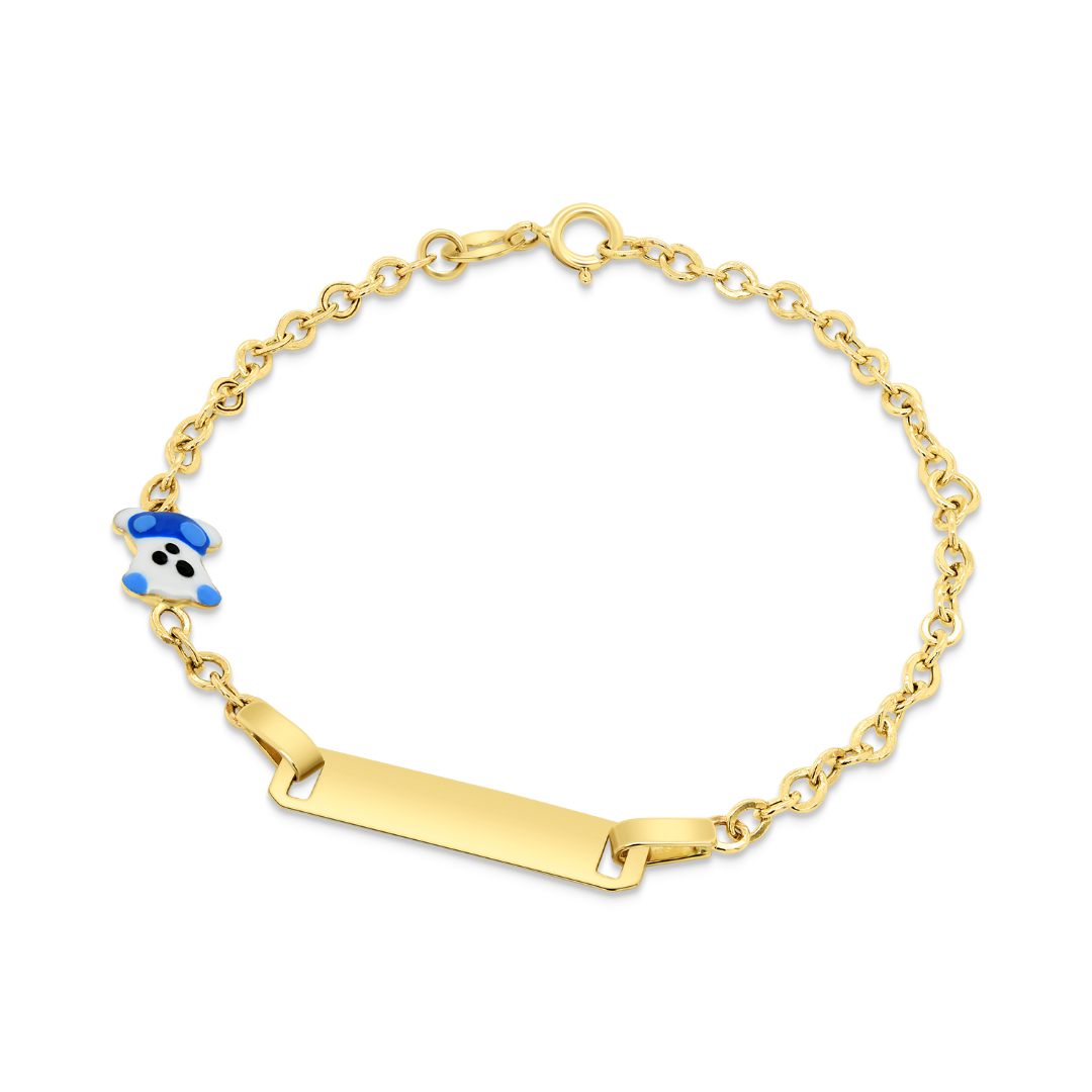 Brățară din aur galben de 14K, reglabilă, cu ursuleț cu email și plăcuță care poate fi gravată.