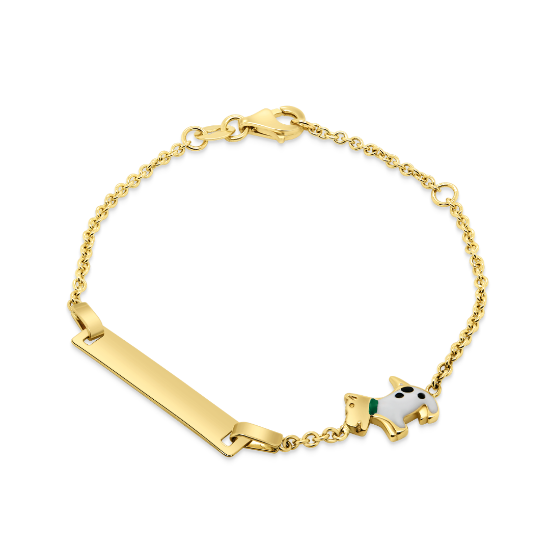 Brățară reglabilă din aur galben de 14K, cu element tip cățeluș și plăcuță care poate fi gravată.