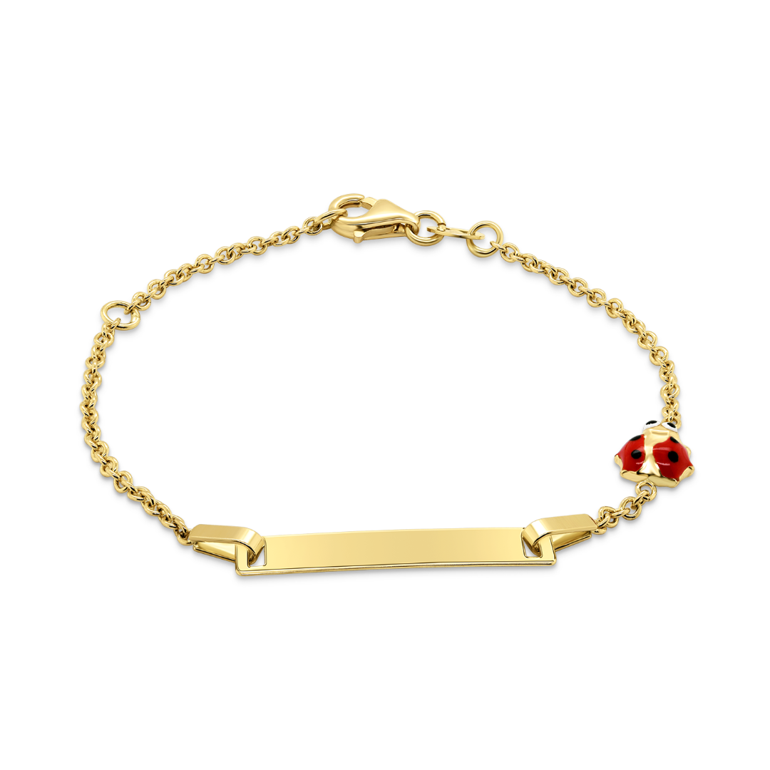 Brățară din aur galben de 14K, cu element tip buburuză cu Email și plăcuță gravabilă.