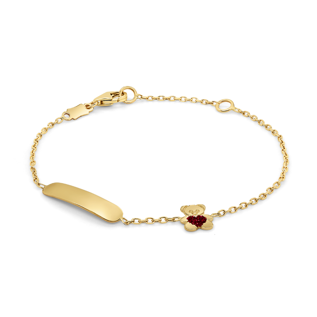 Brățară din aur galben de 14K, cu plăcuță și pandantiv ursuleț.