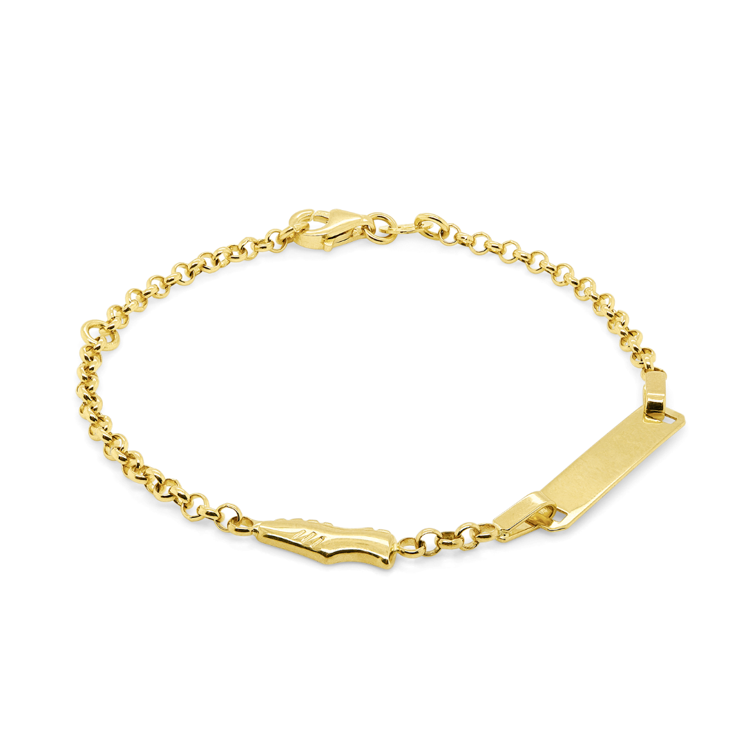 Brățară din aur galben de 14K, cu pandantiv și plăcuță ce poate fi personalizată.
