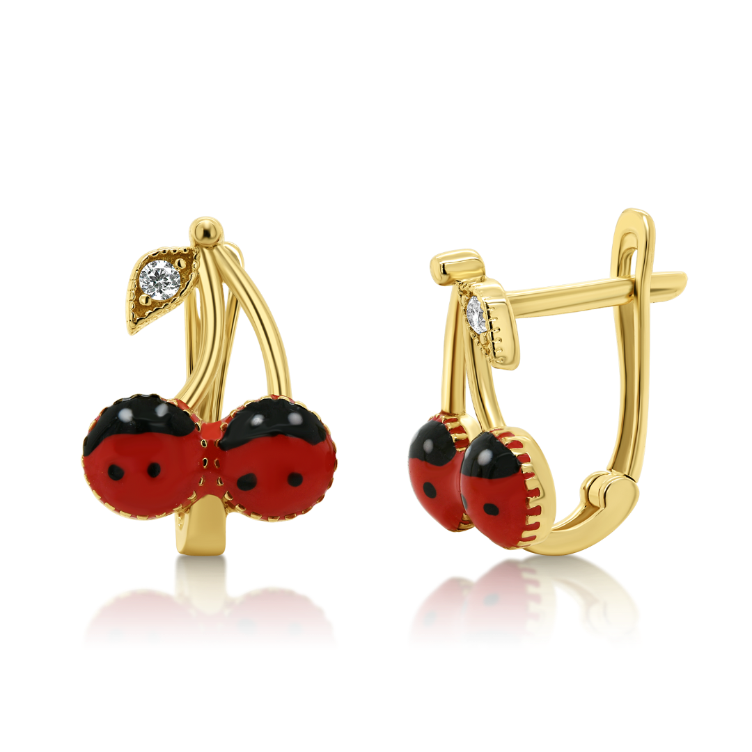 Cercei din aur galben de 14K cu elemente tip cireșe cu email și pietre Cubic Zirconia albe