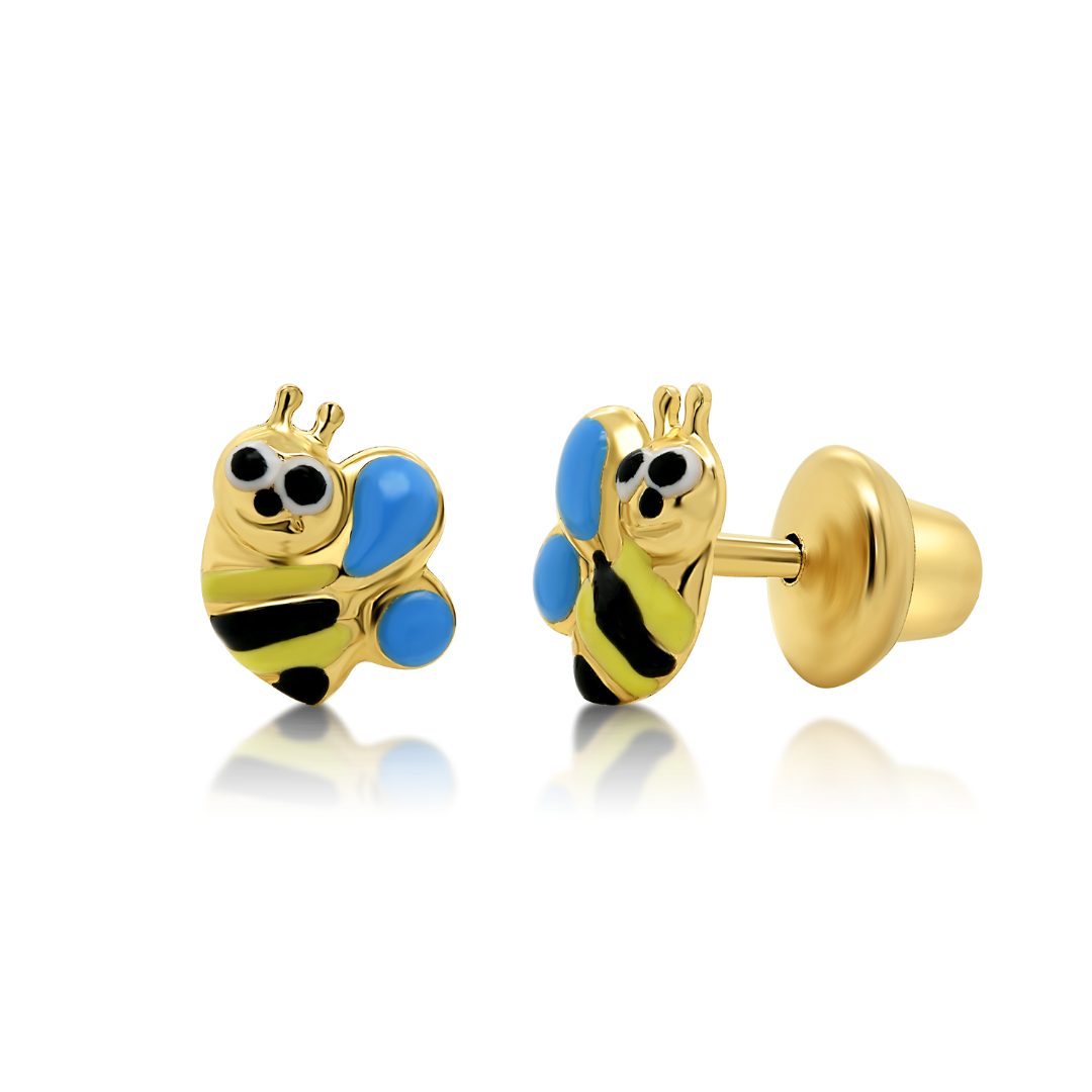 Cercei în formă de albină din aur galben de 14K, și Email colorat.