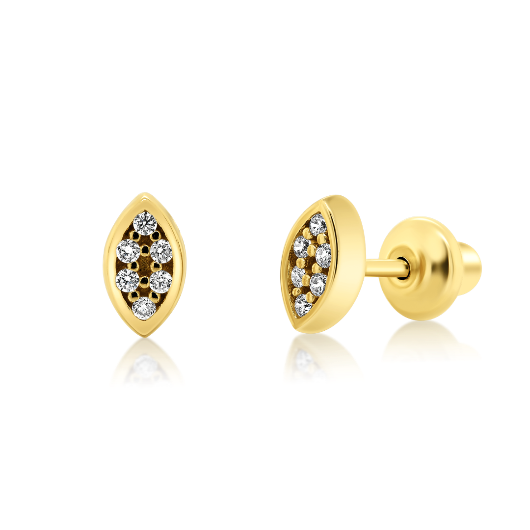 Cercei din aur galben de 14K, cu pietre Cubic Zirconia albe și închidere cu protecție.