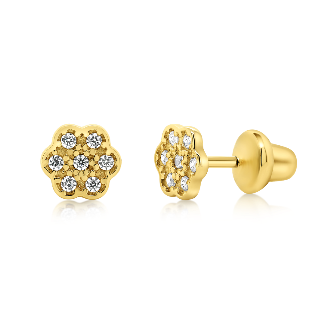 Cercei pentru copii din aur galben de 14K, cu pietre zirconia și închidere cu protecție.