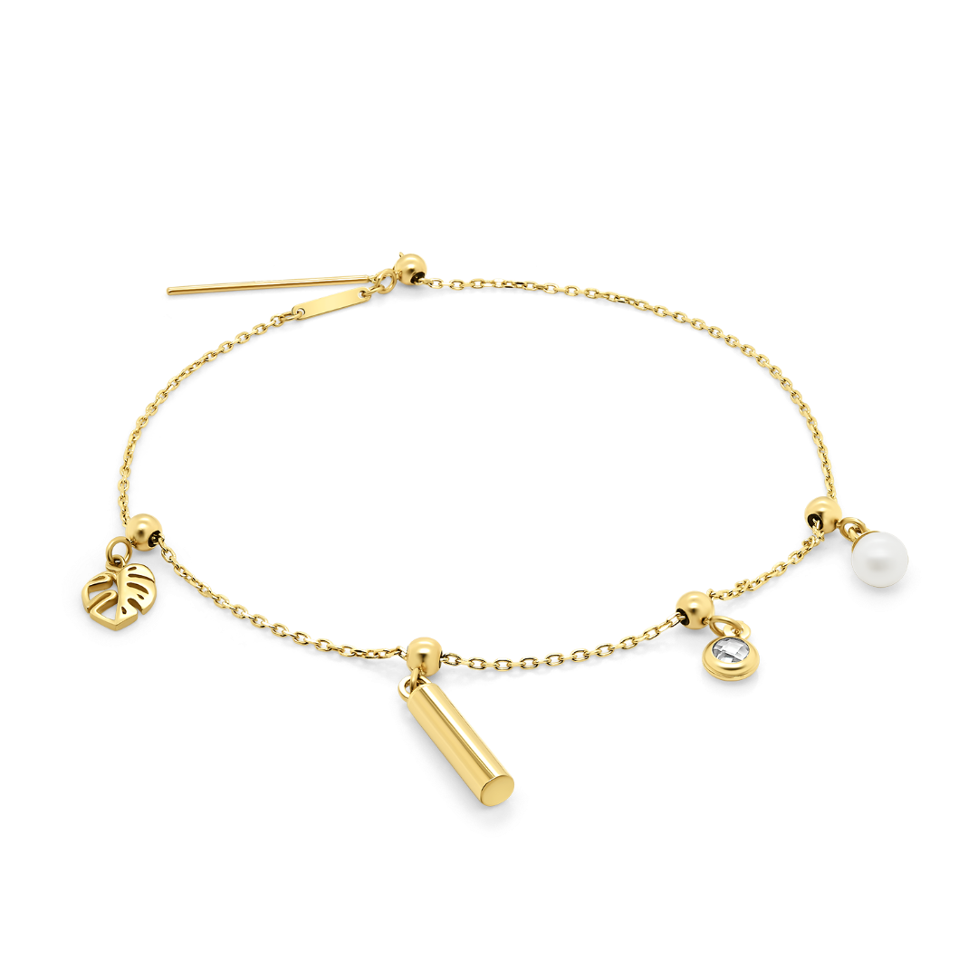 Brățară din aur galben de 14K cu diferite modele de pandantive. Acestea pot fi așezate pe suprafața lanțului după preferințe.