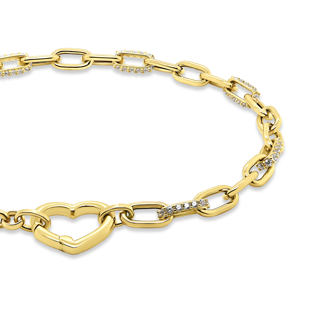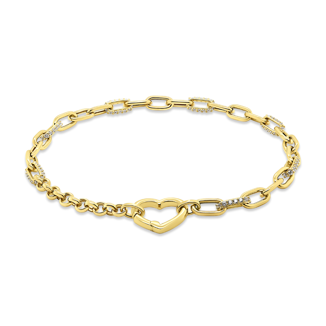 Brățară din aur galben de 14K cu două tipuri de zale și element în formă de inimă.