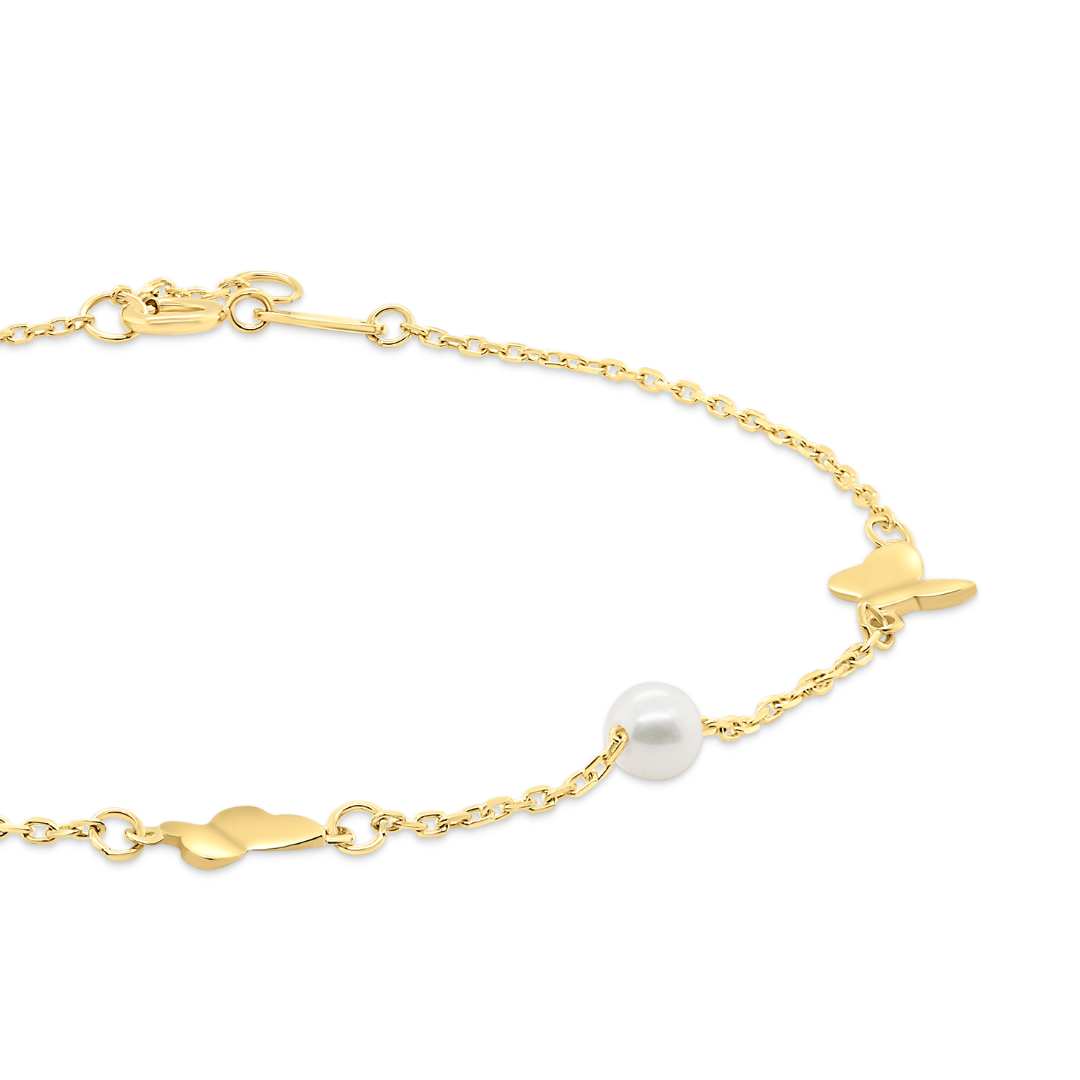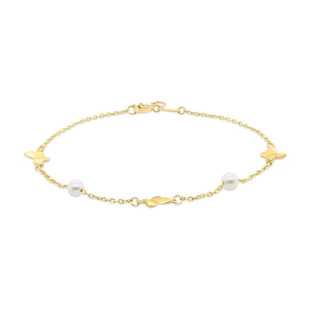 Brățară din aur galben de 14K cu perle de cultură și pandantive fluturași.