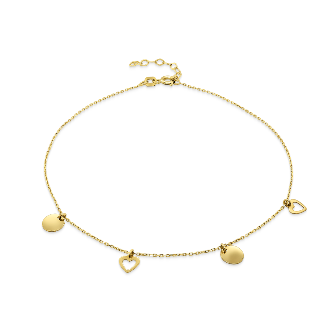 Brățară de picior din aur galben de 14K, cu elemente tip inimă și bănuți.