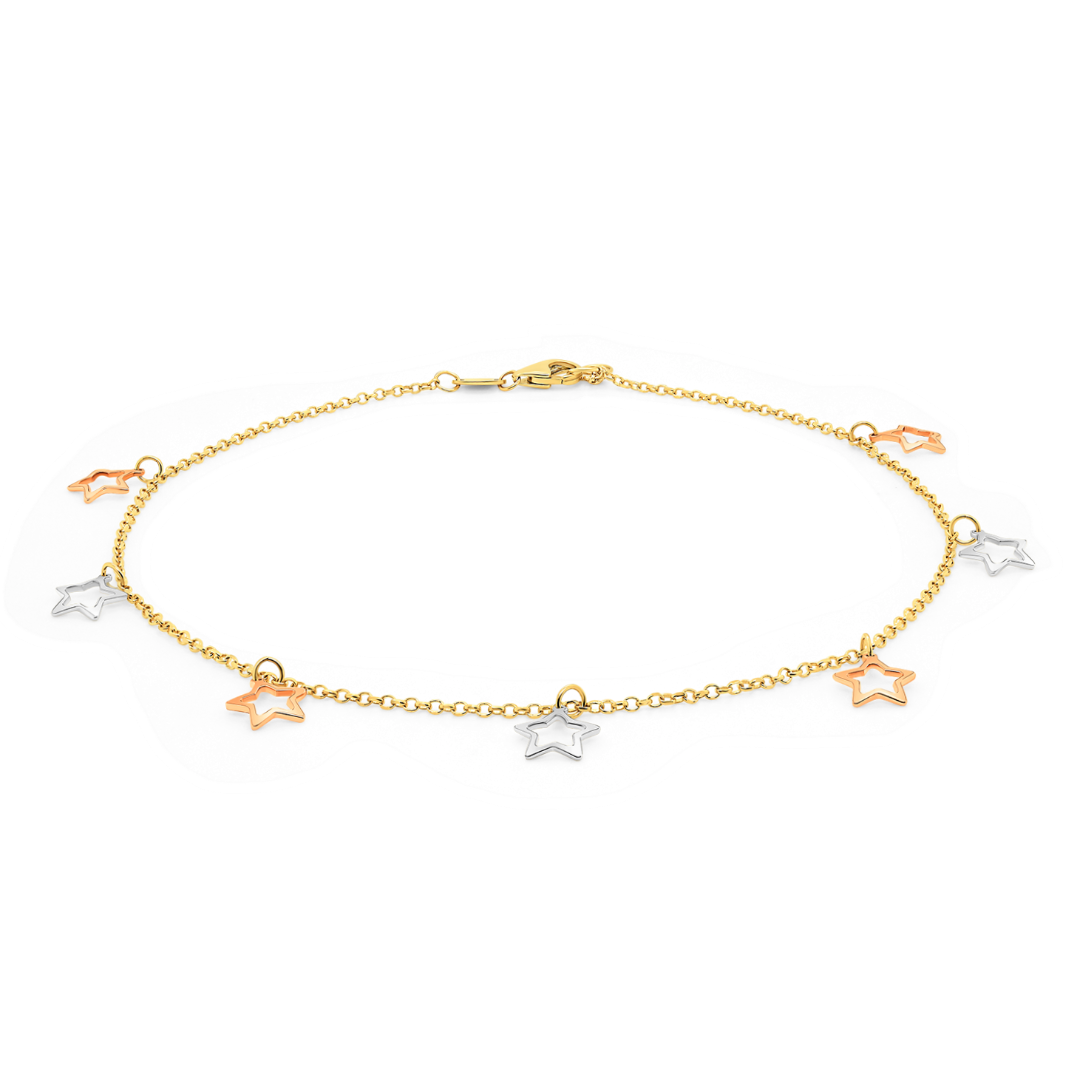 Brățară de picior din aur galben de 14K, cu pandantive în formă de stea din aur alb și roz.