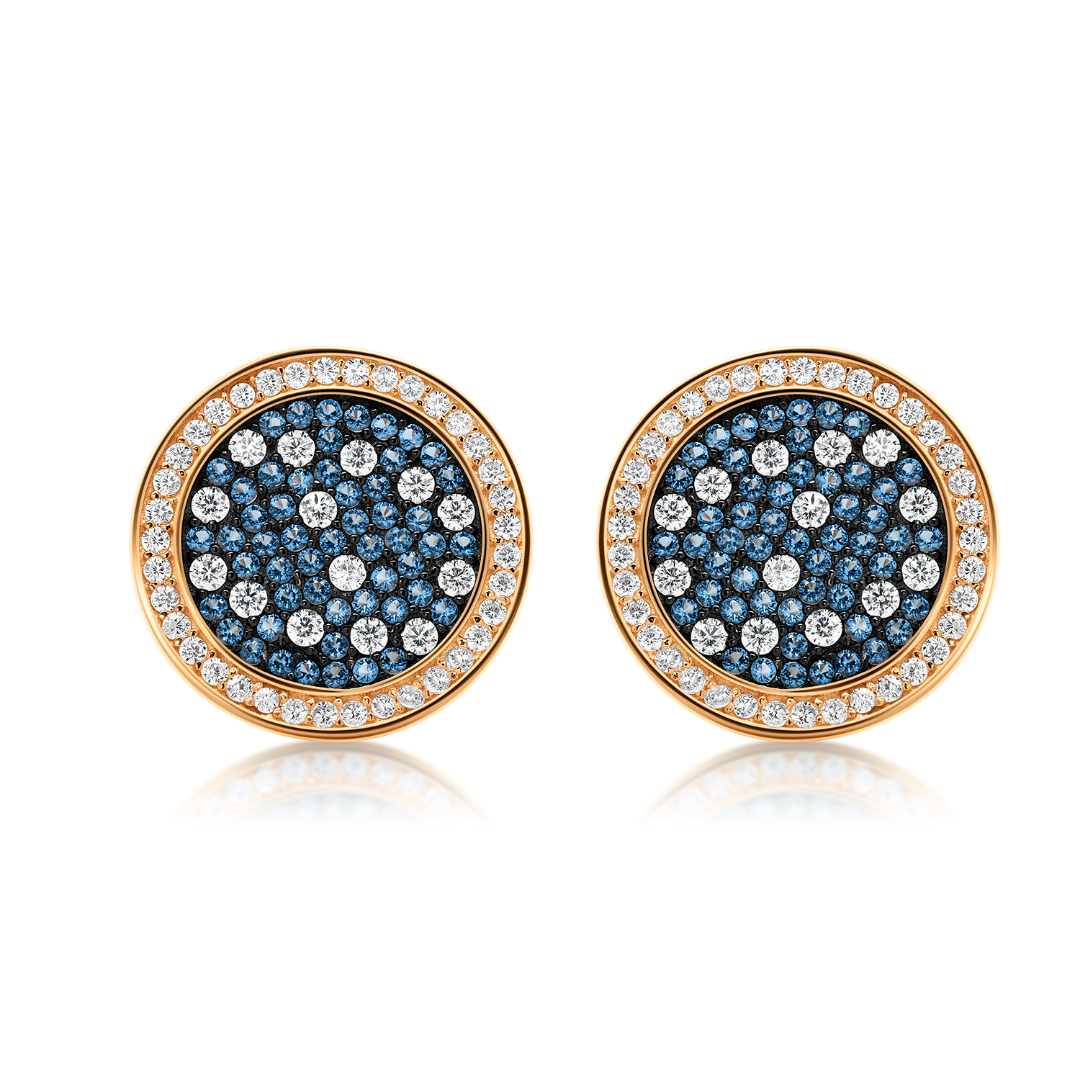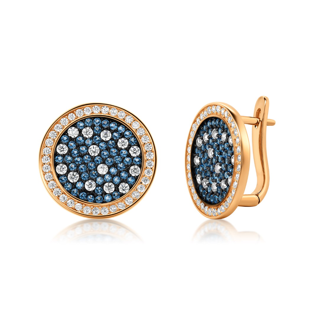 Cercei din aur roz de 14K cu pietre Cubic Zirconia albe și albastre.