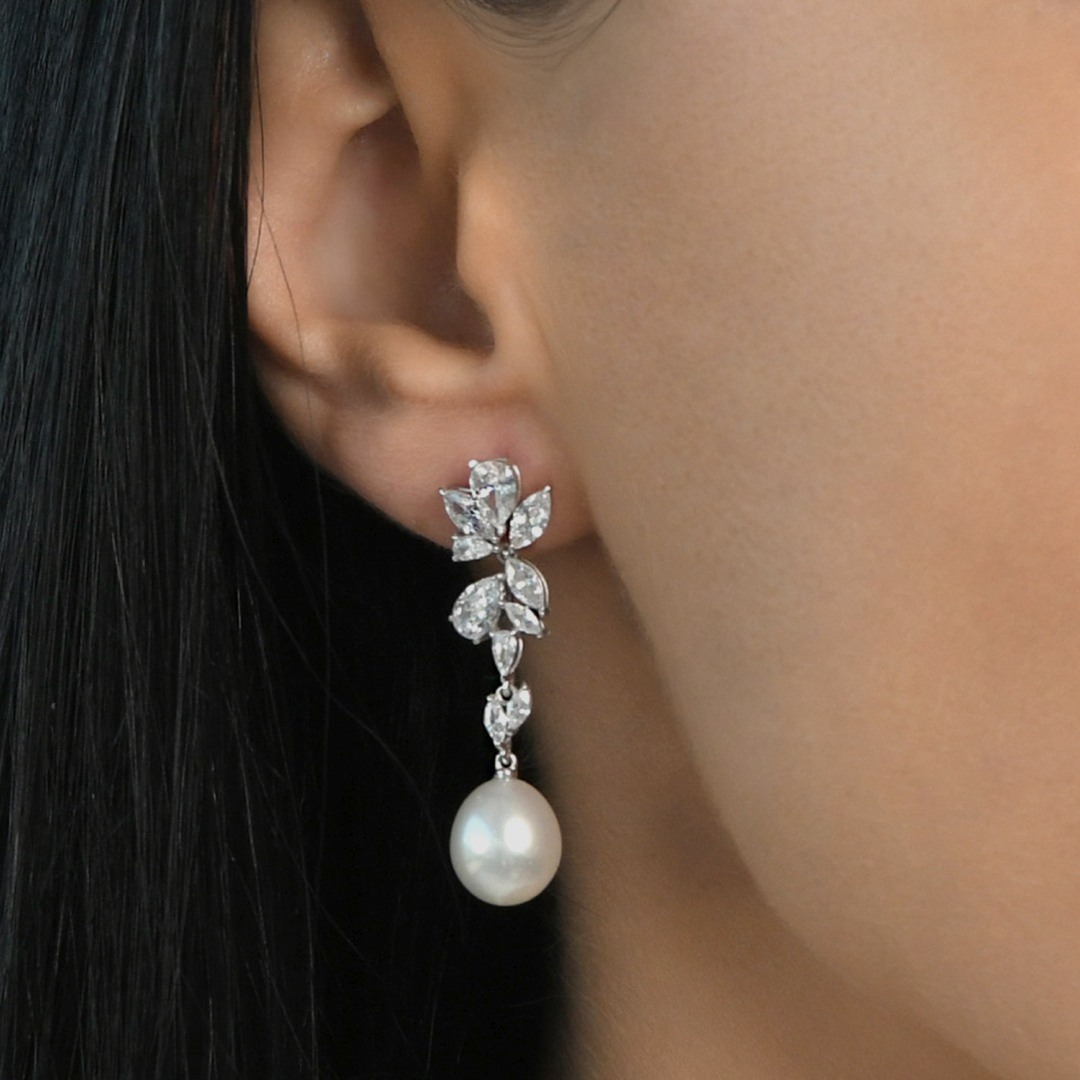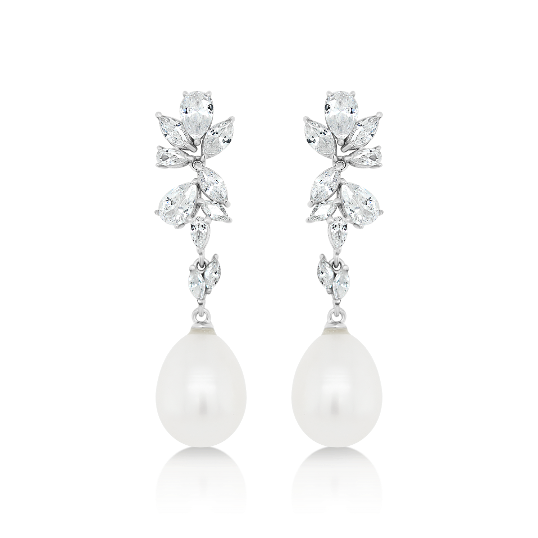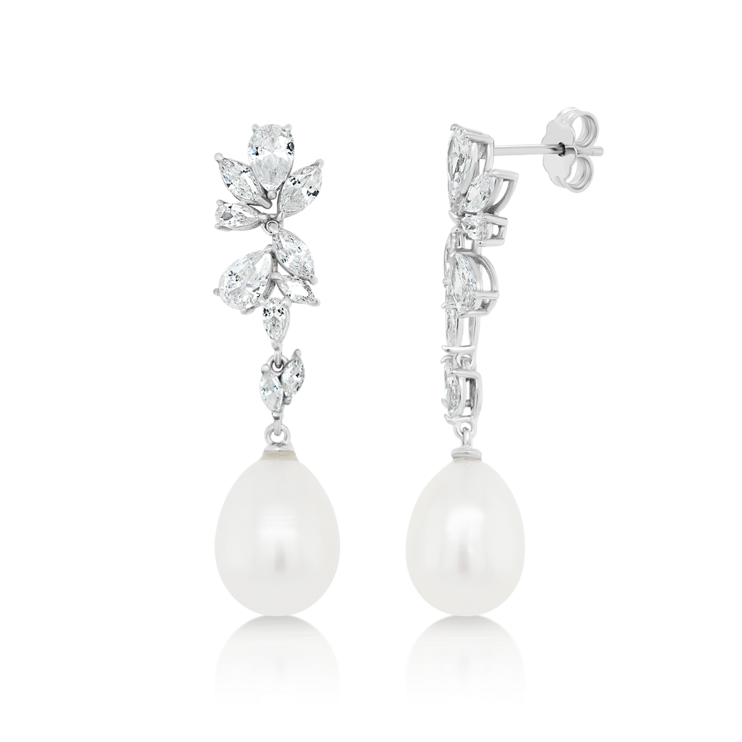 Cercei din aur alb de 14K, cu Perle de cultură și pietre cubic zirconia.