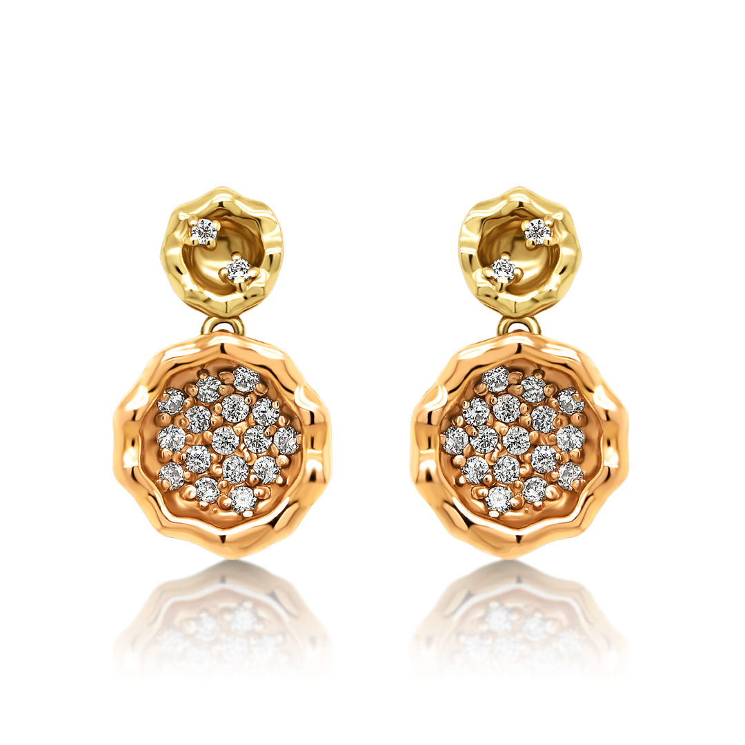 Cercei din aur galben de 14K cu element rotund din aur roz și pietre cubic zirconia.