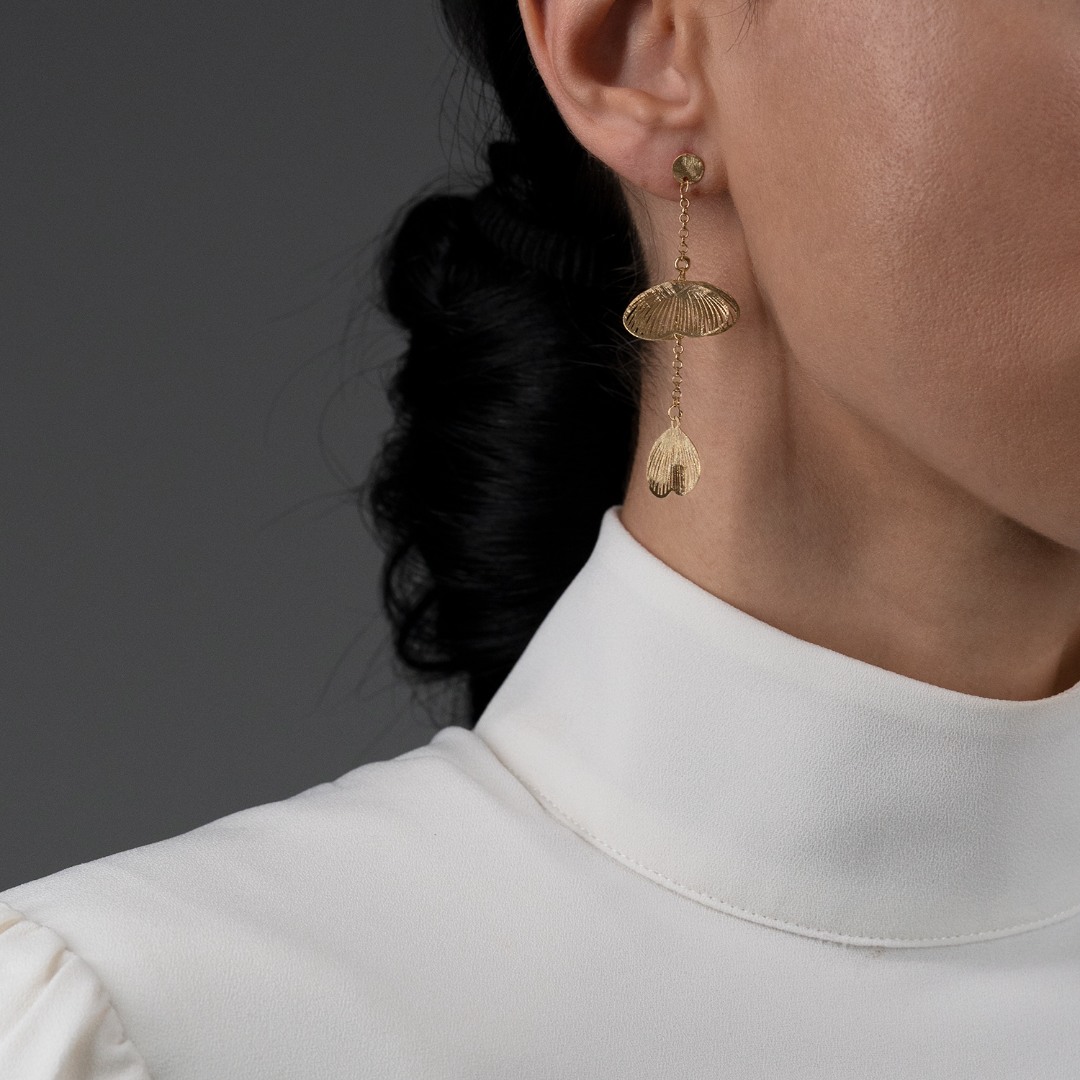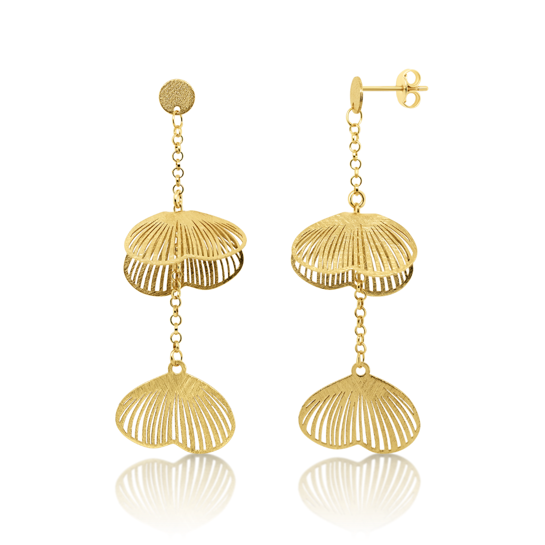Cercei realizați manual din aur galben de 14K, cu elemente în formă de fluturi.
