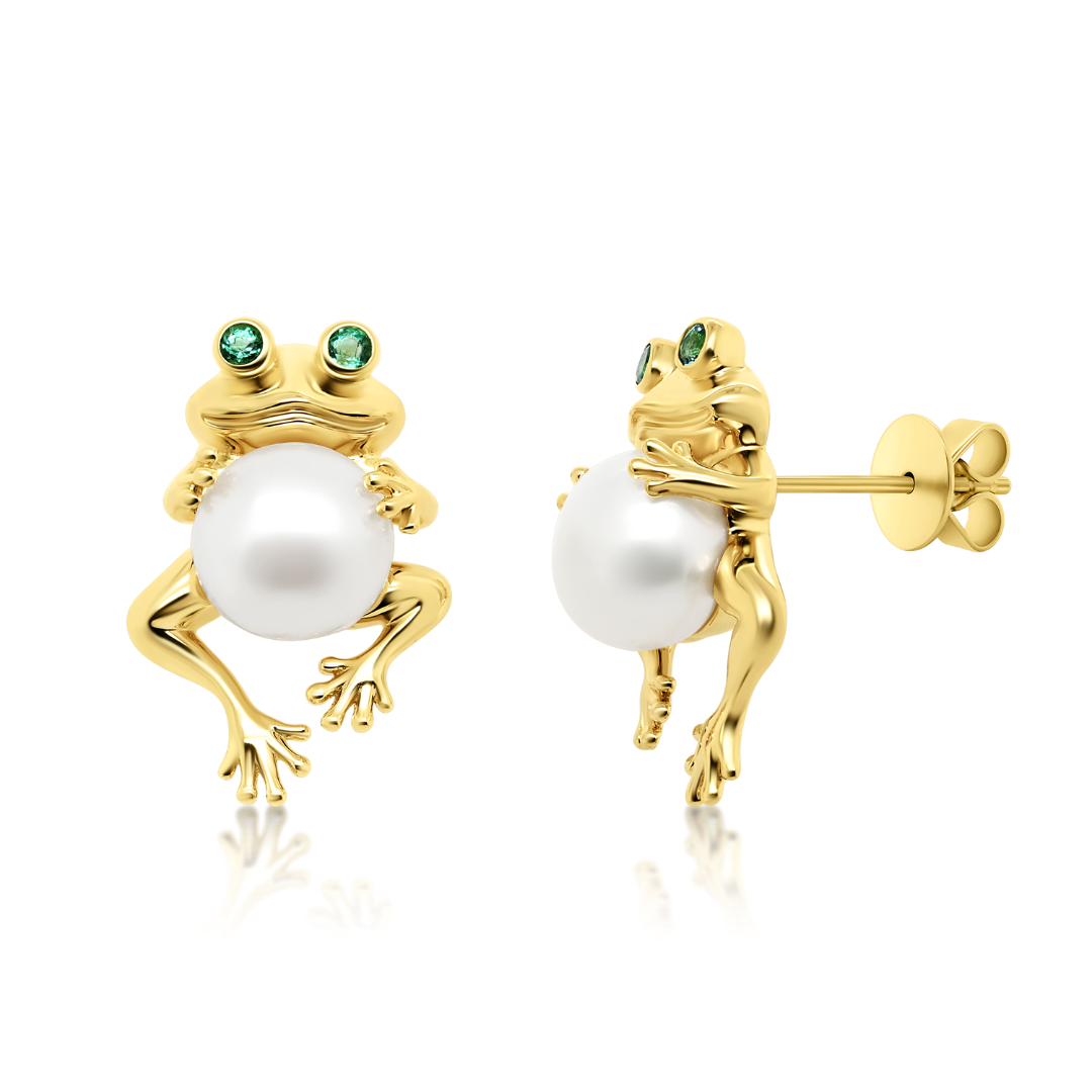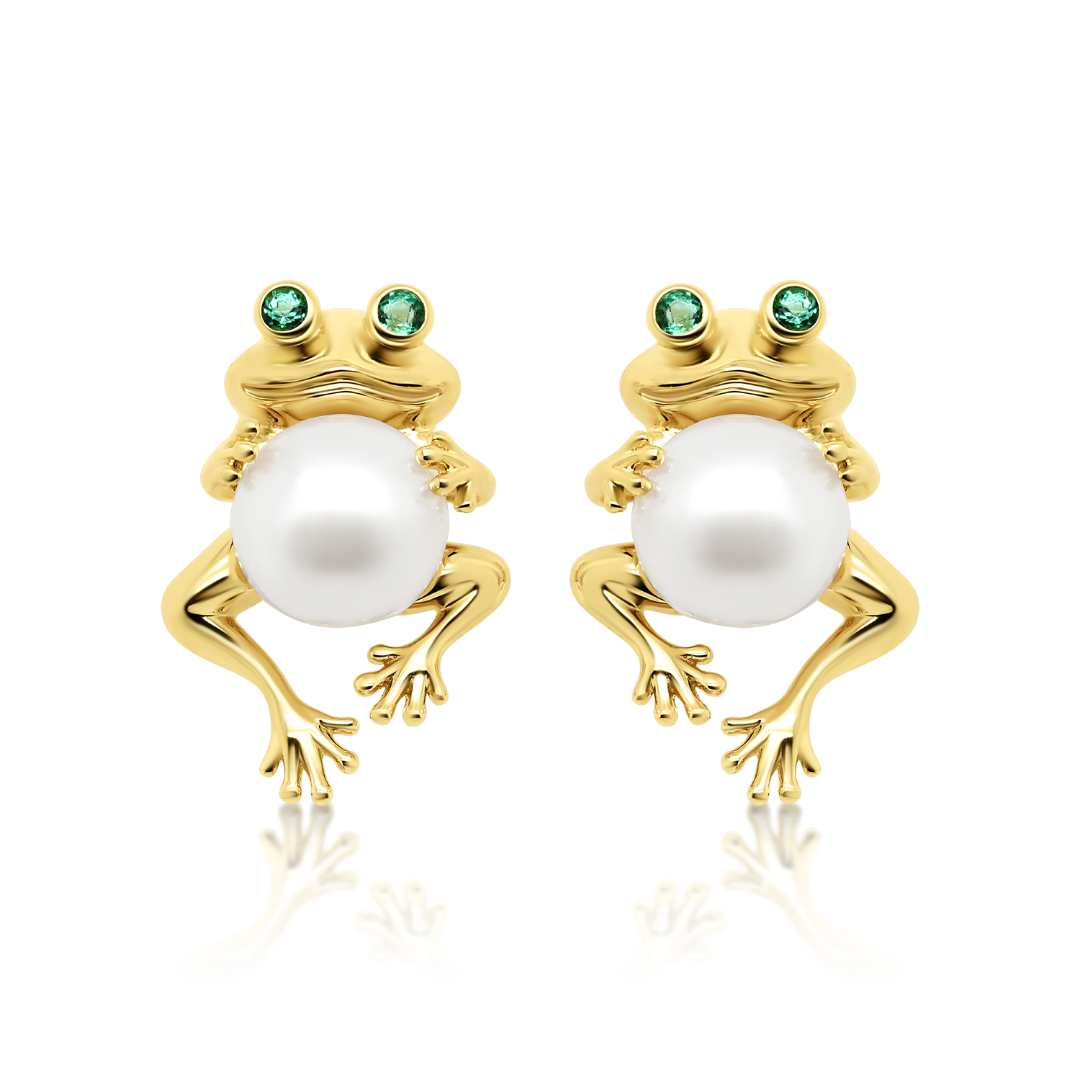 Cercei din aur galben de 18K cu Perle de cultură și Smaralde naturale.