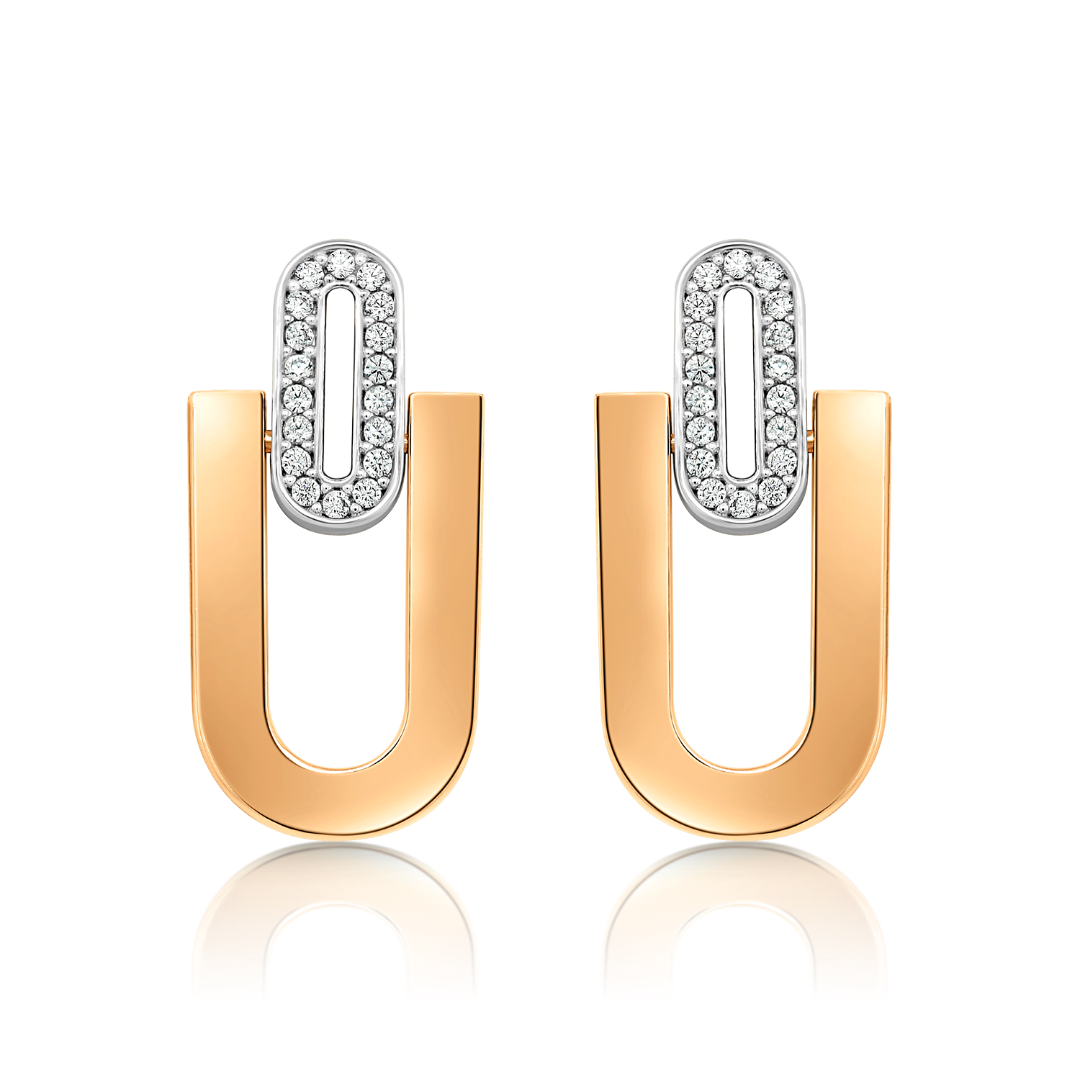 Cercei din aur roz de 14K cu pietre cubic zirconia și element din aur alb.