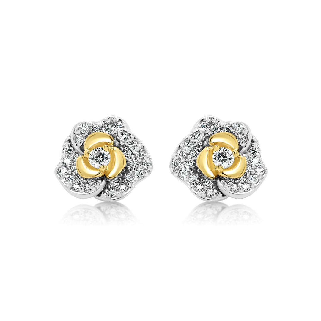 Cercei floare din aur alb de 14K cu inserții din aur galben și pietre cubic zirconia.