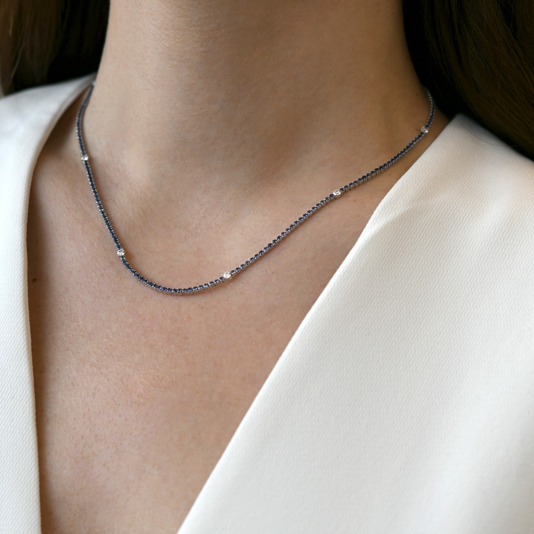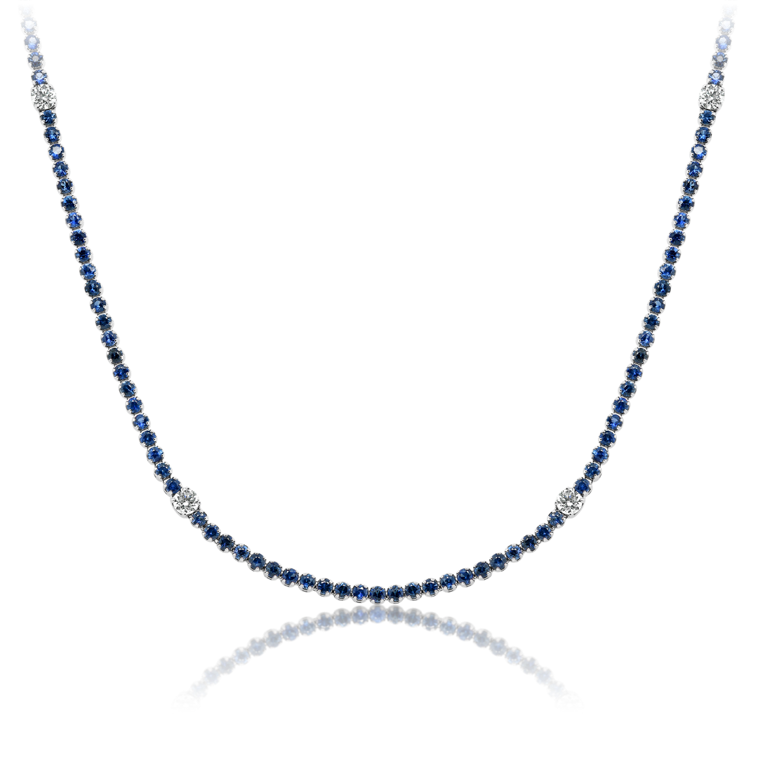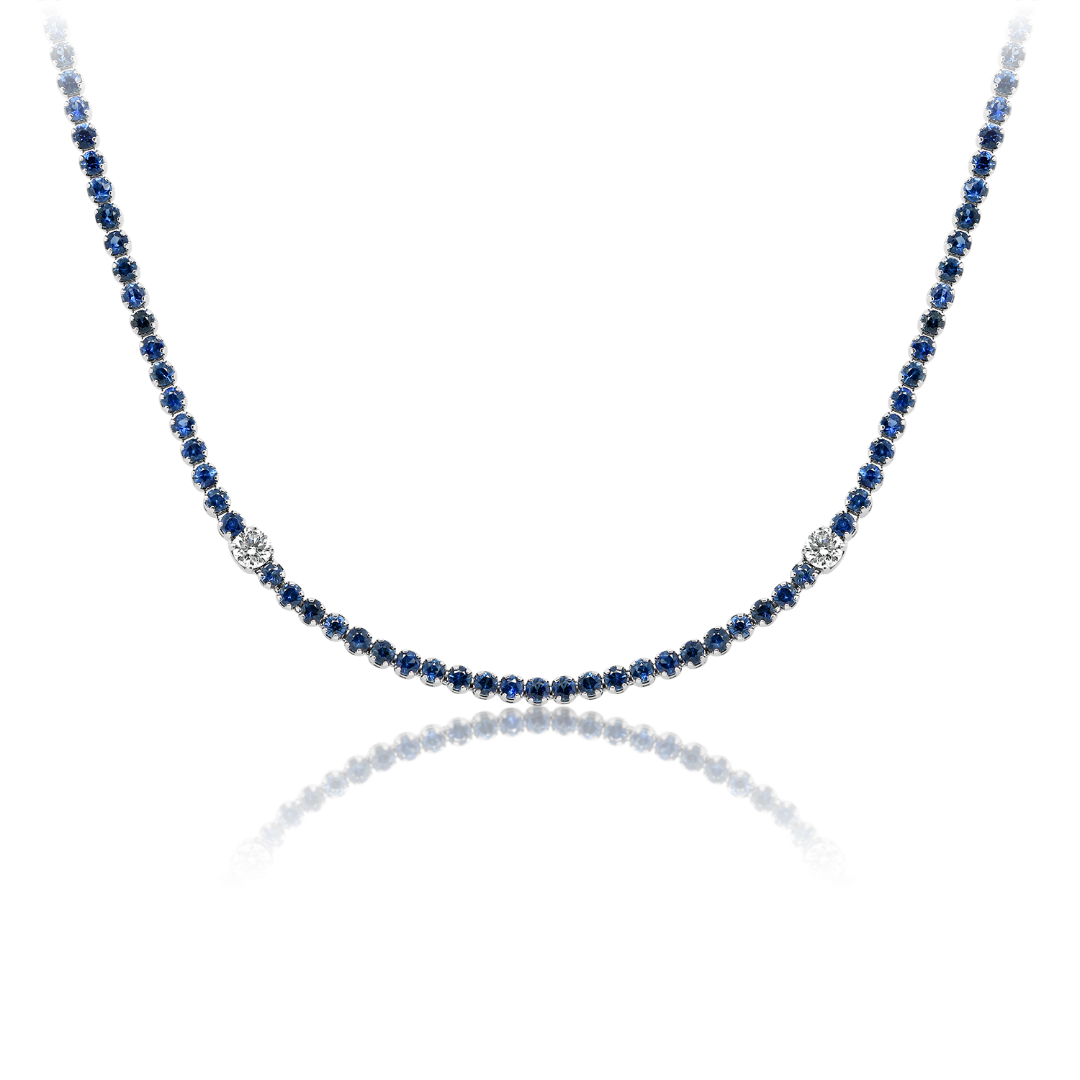 Colier din aur alb de 18K, încrustat cu 8 Diamante Round Brilliant de 0.74ct și 207 Safire albastre cu o greutate totală de 5.45ct.