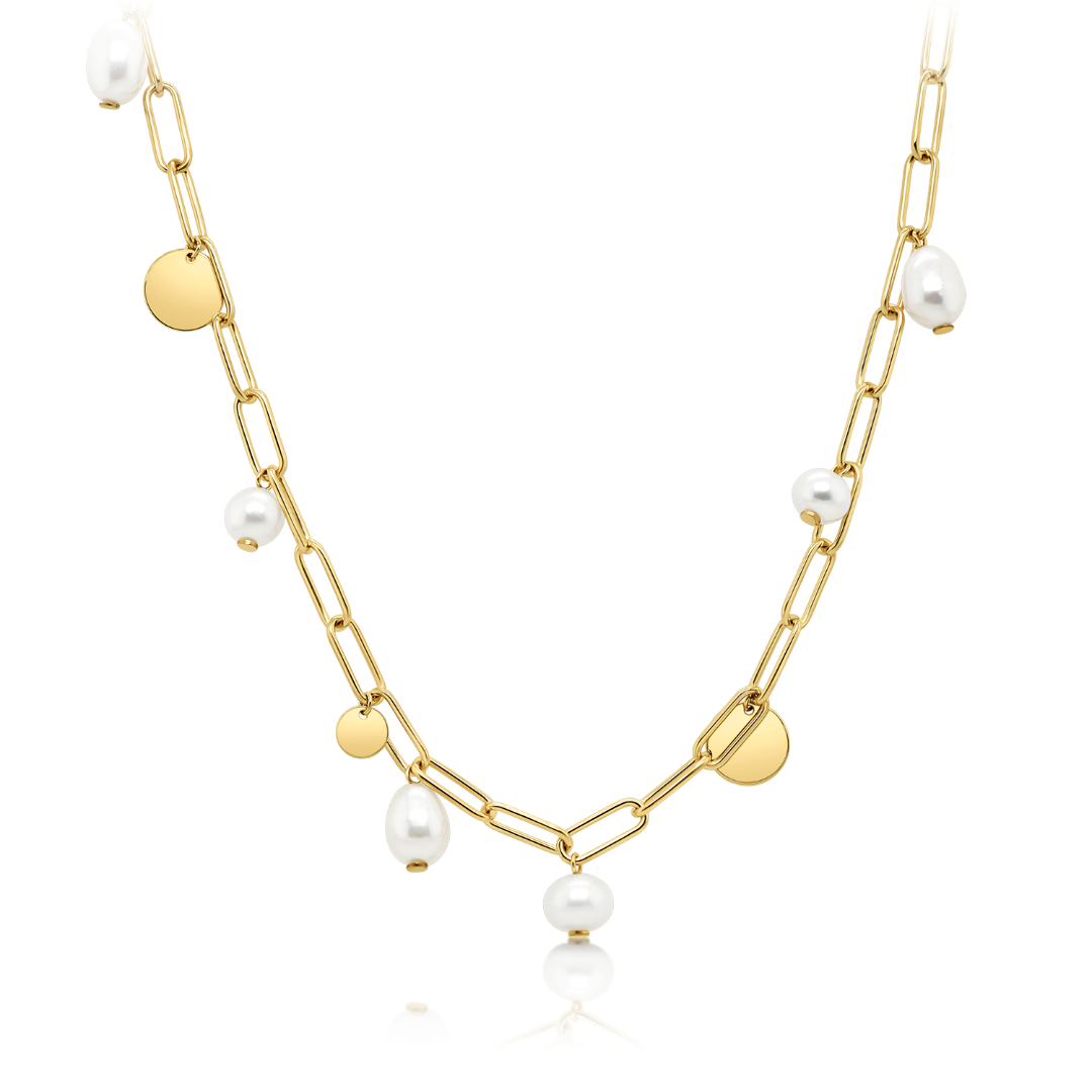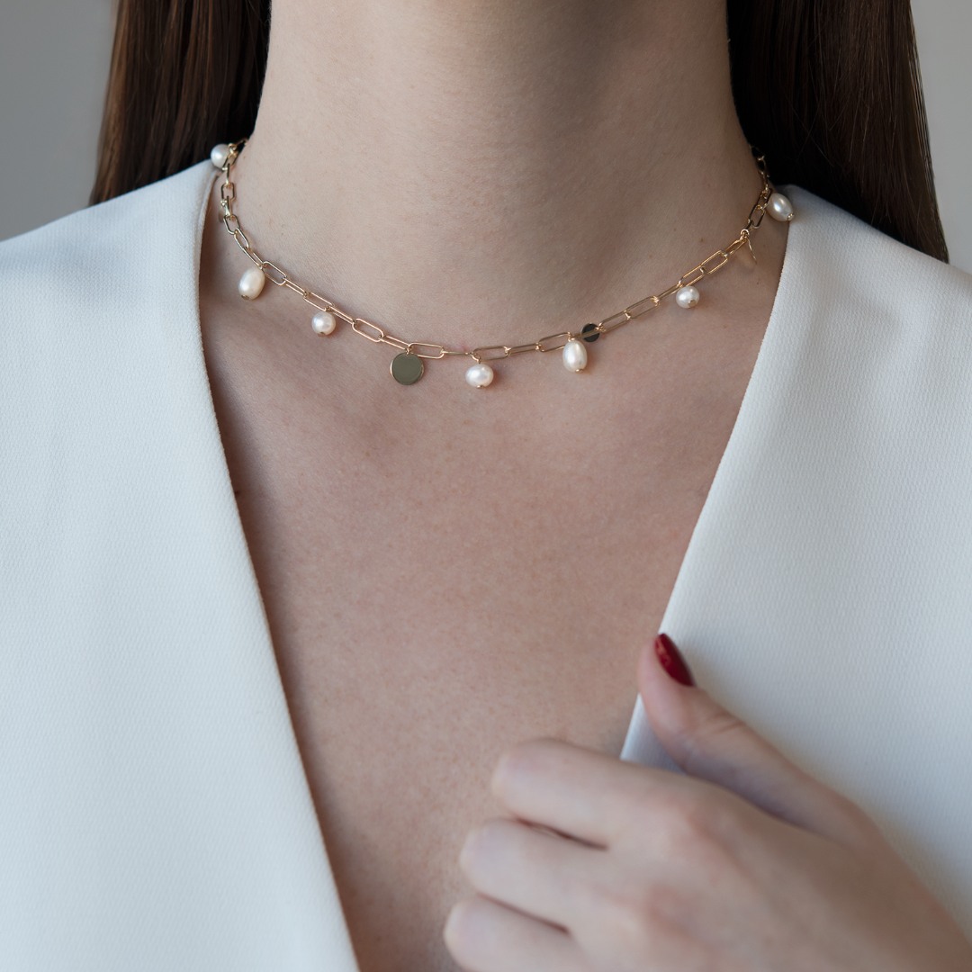 Colier din aur galben de 14K cu pandantive rotunde și Perle de cultură.