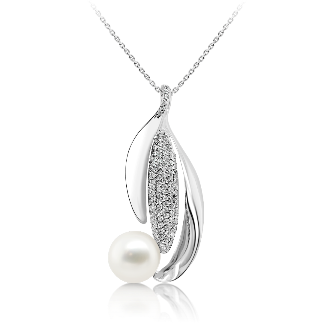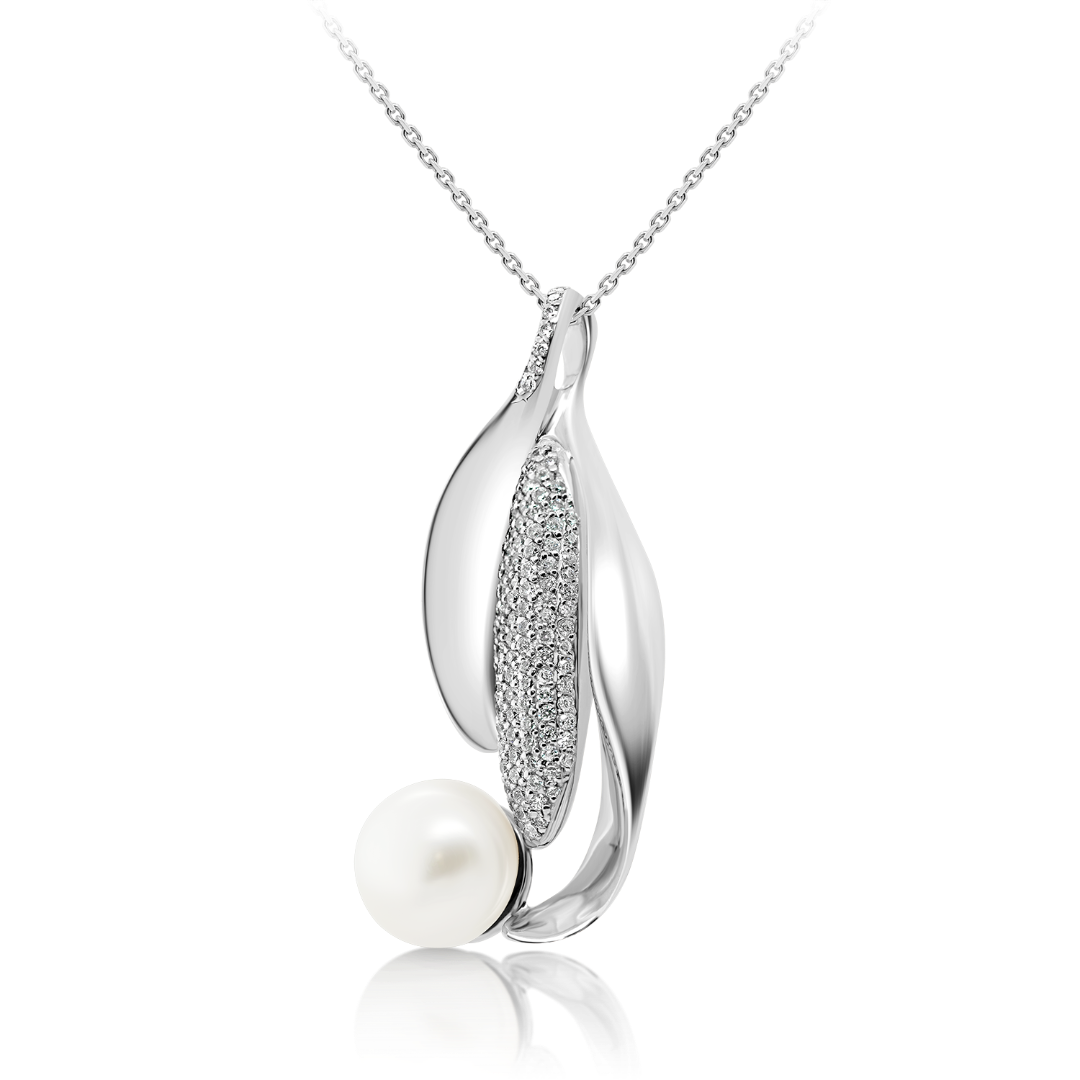 Lanț din aur alb de 14K și pandantiv cu Perlă albă și zirconii incolore.
