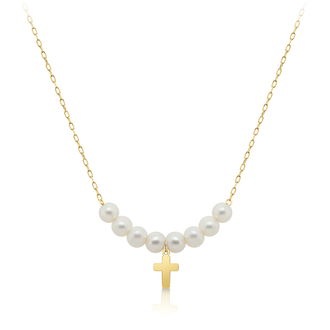 Lanț cu pandantiv din aur galben de 14K și perle de cultură.
