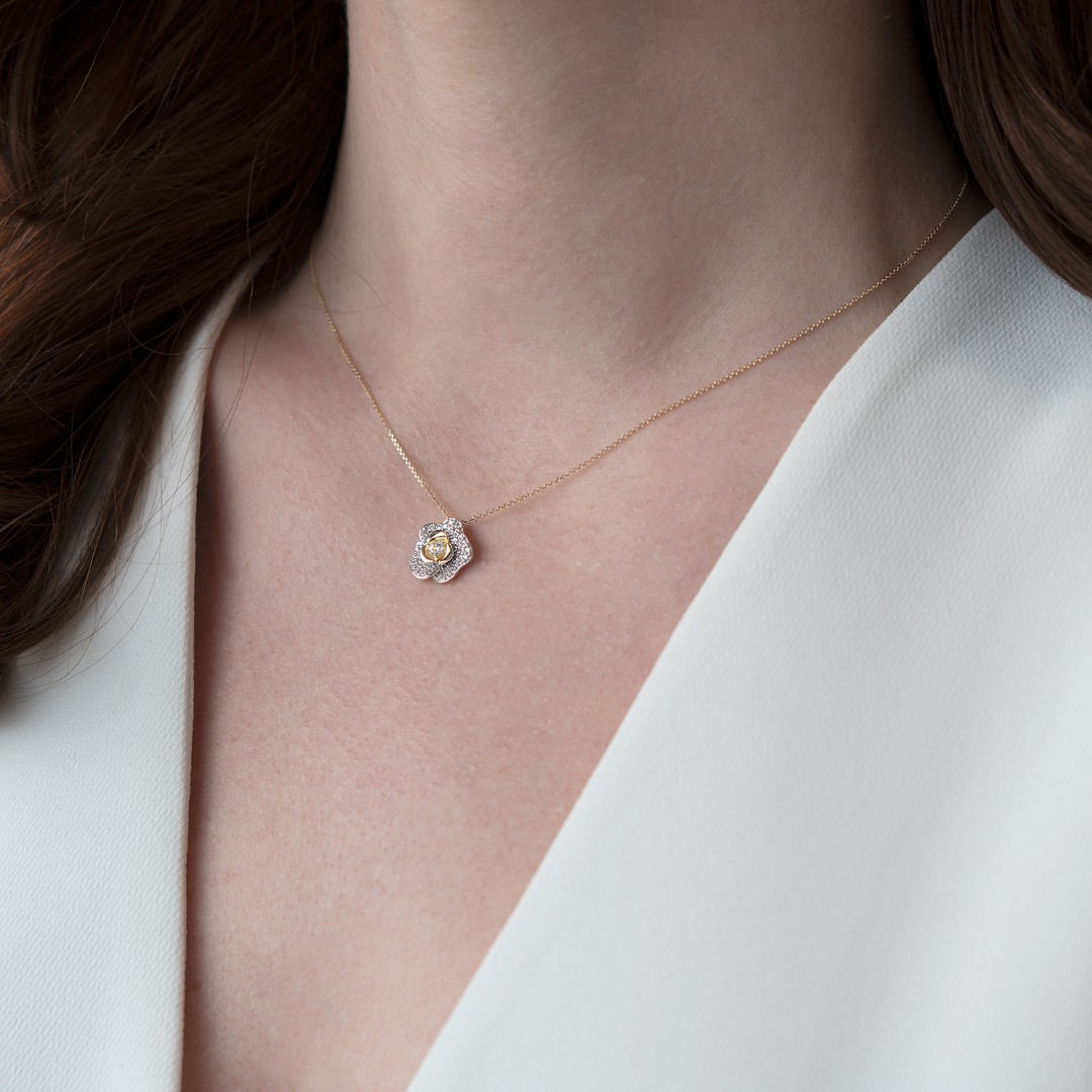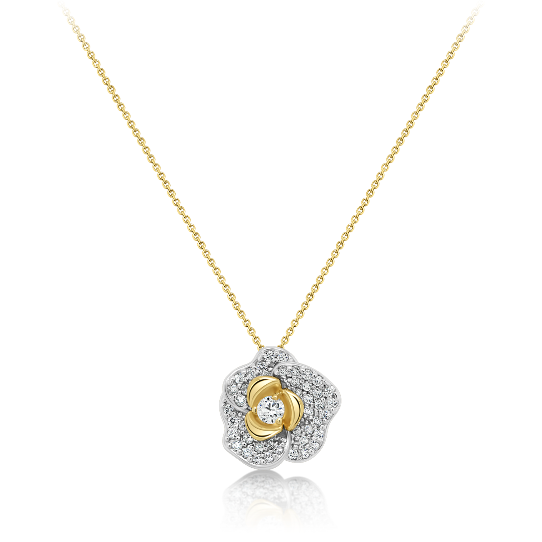 Lanț cu pandantiv floare din aur galben de 14K cu pietre cubic zirconia.