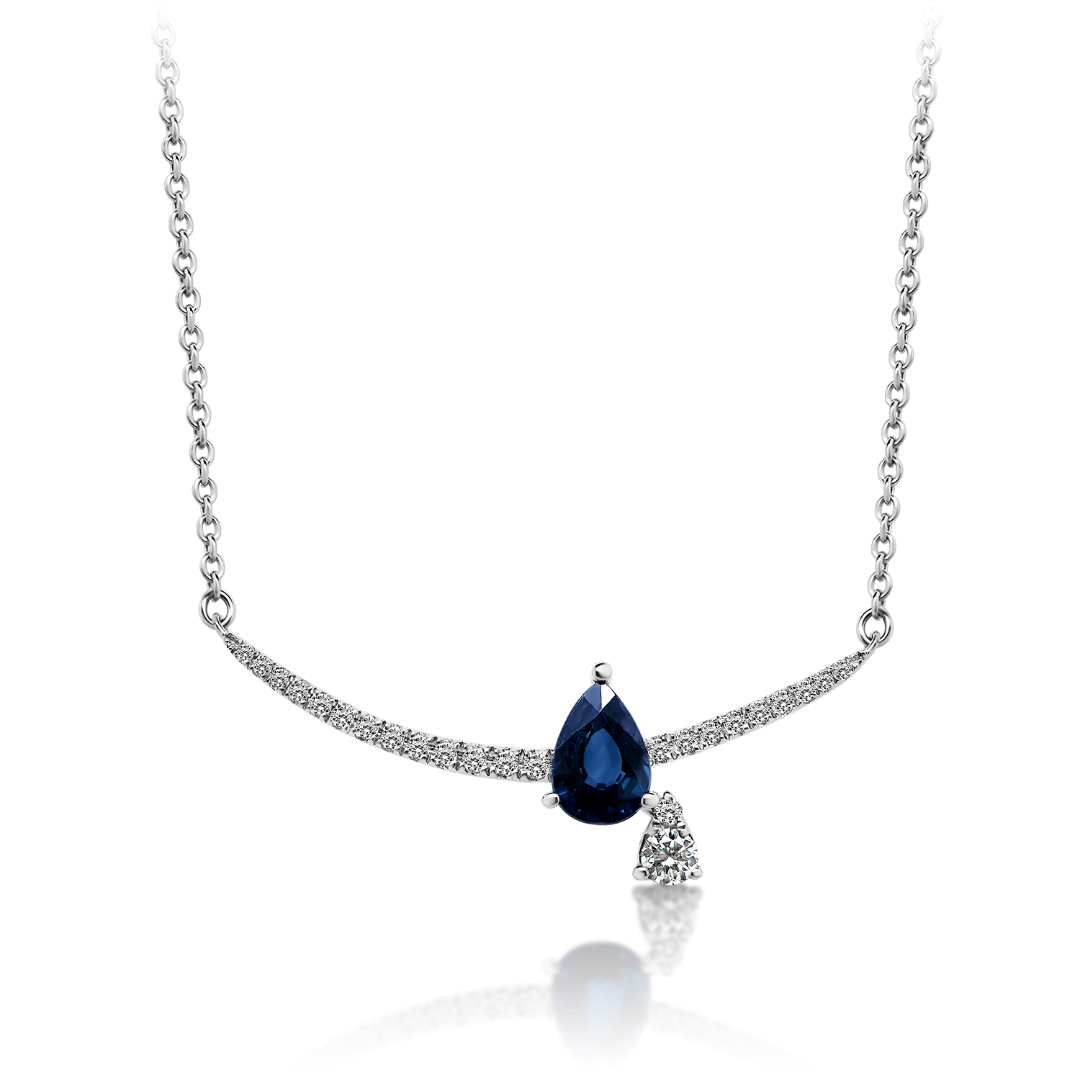 Lanț din aur alb de 18K și pandantiv încrustat cu 24 de Diamante Round Brilliant de 0.14ct și un Safir albastru de 0.52ct.
