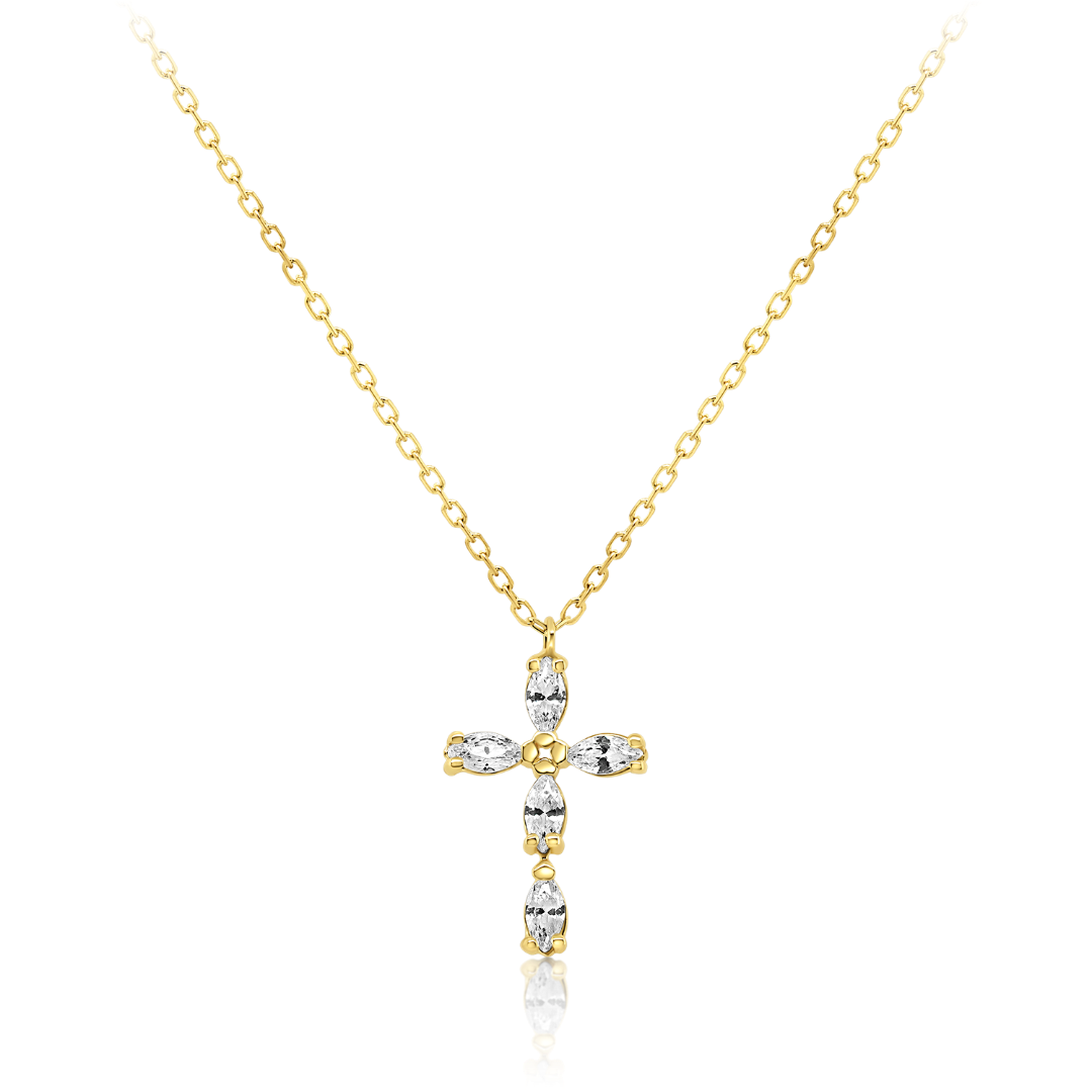 Lanț din aur galben de 14K și pandantiv cruce cu pietre cubic zirconia.