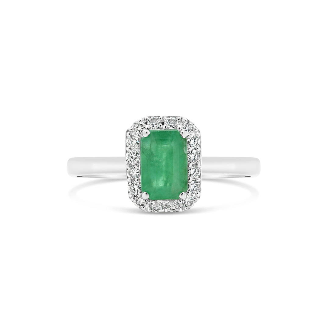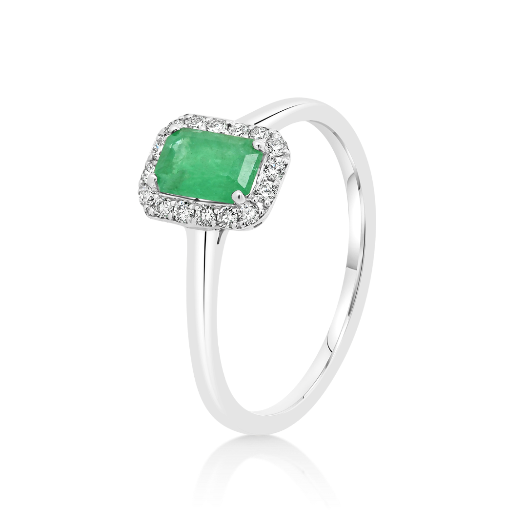 Inel din aur alb de 18K, cu un Smarald de 0.53ct și 16 Diamante Round Brilliant de 0.12ct.