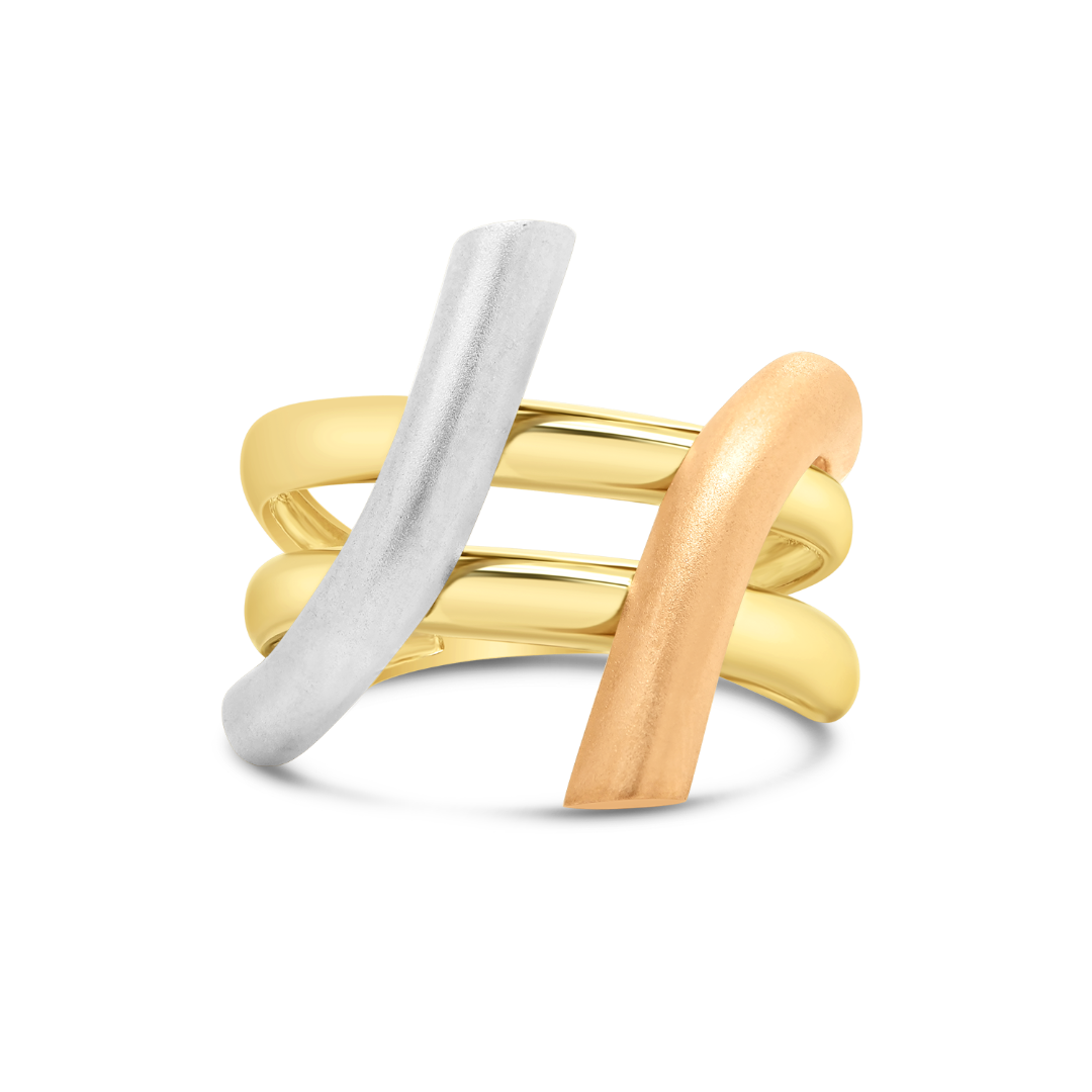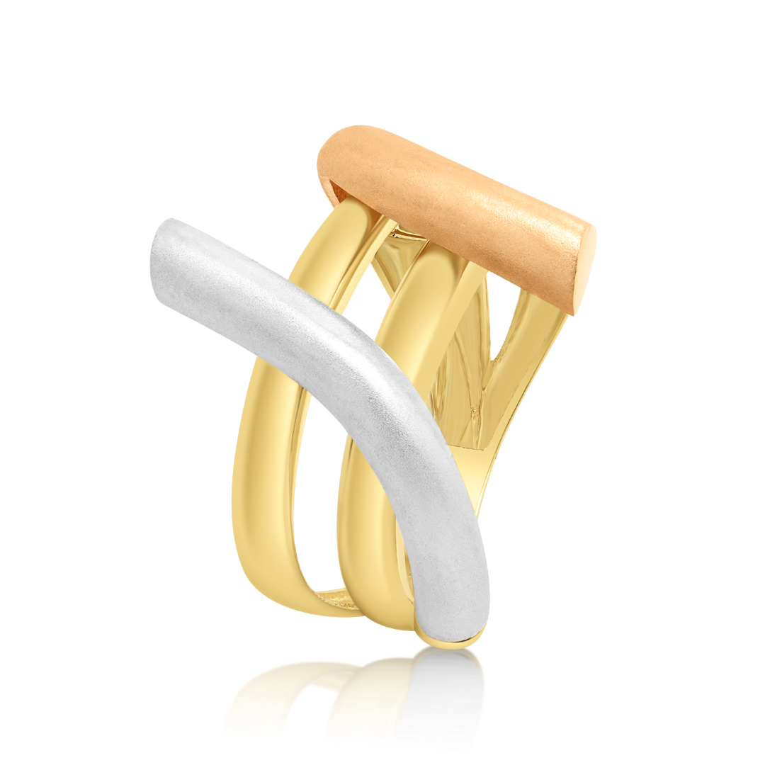 Inel din aur galben de 14K cu elemente satinate din aur alb si roz.