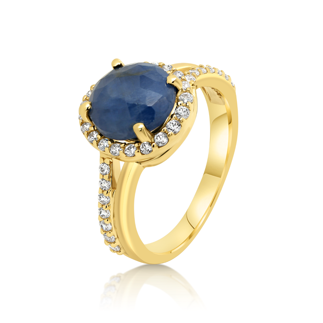 Inel din aur galben de 14K cu zirconia incolore și Corindon albastru.