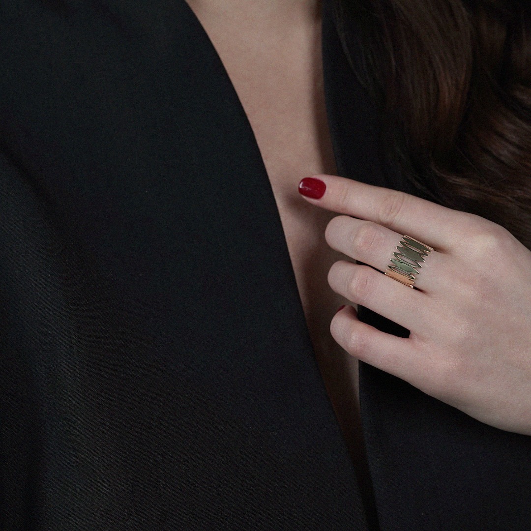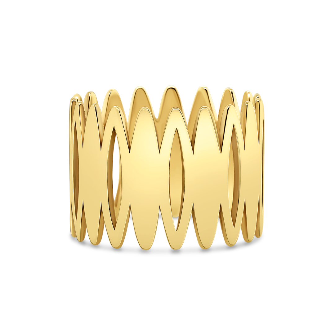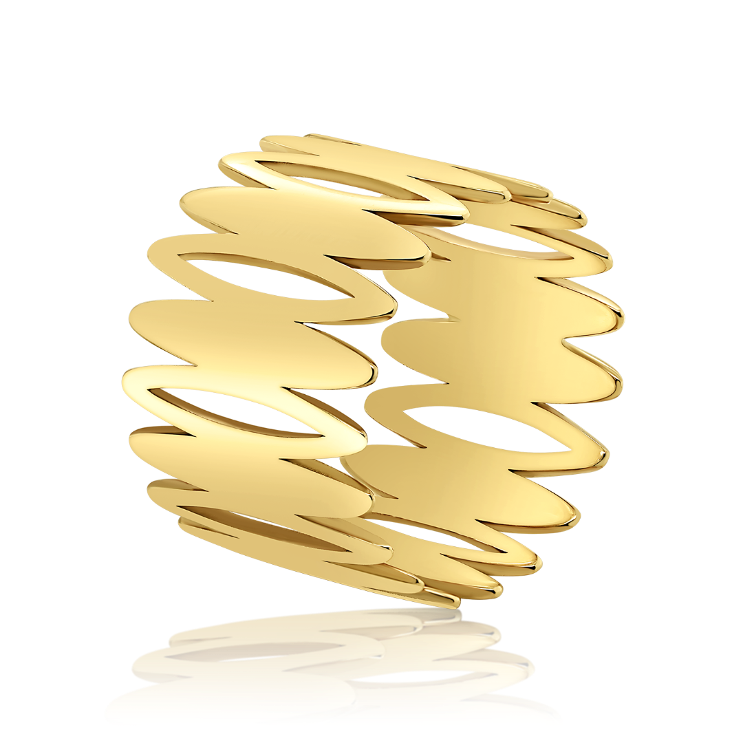 Inel cu elemente decupate din aur galben de 14K.