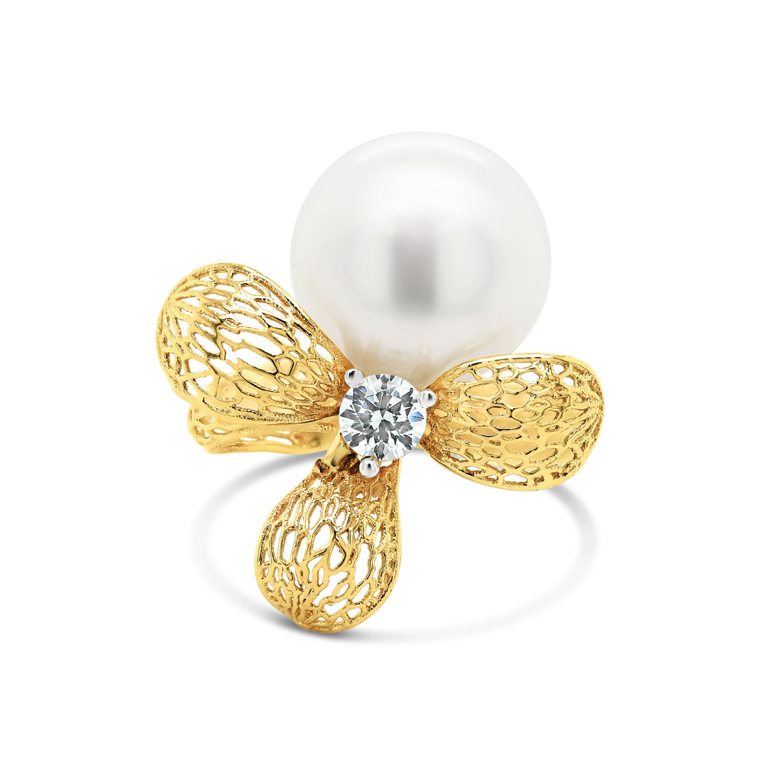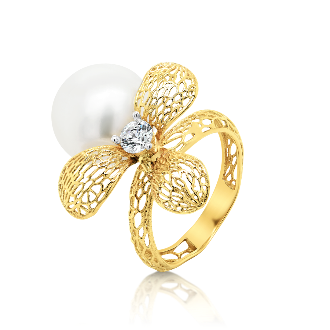 Inel din aur galben de 14K, cu Perlă și cubic zirconia.