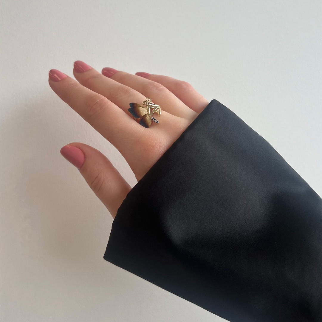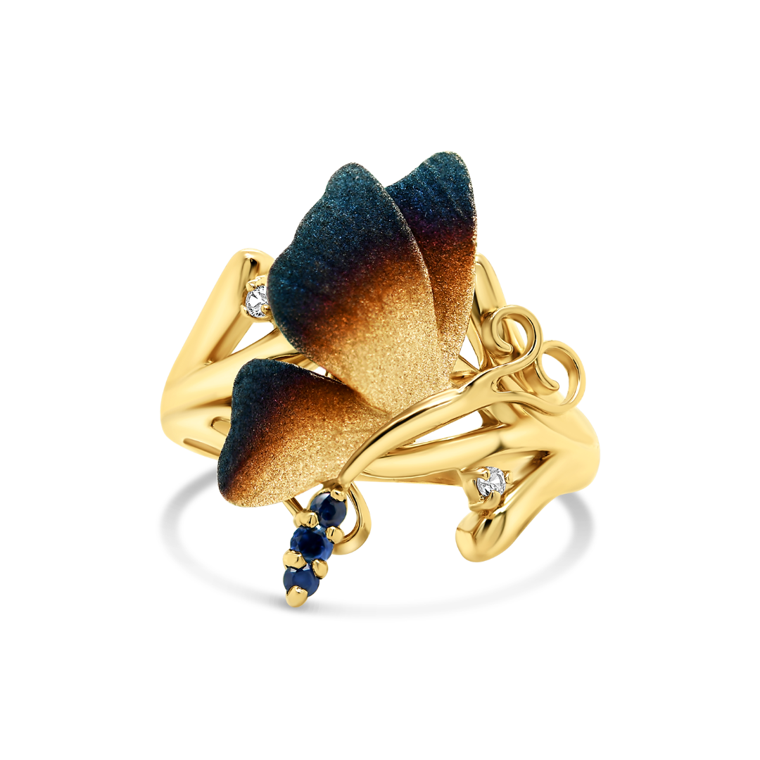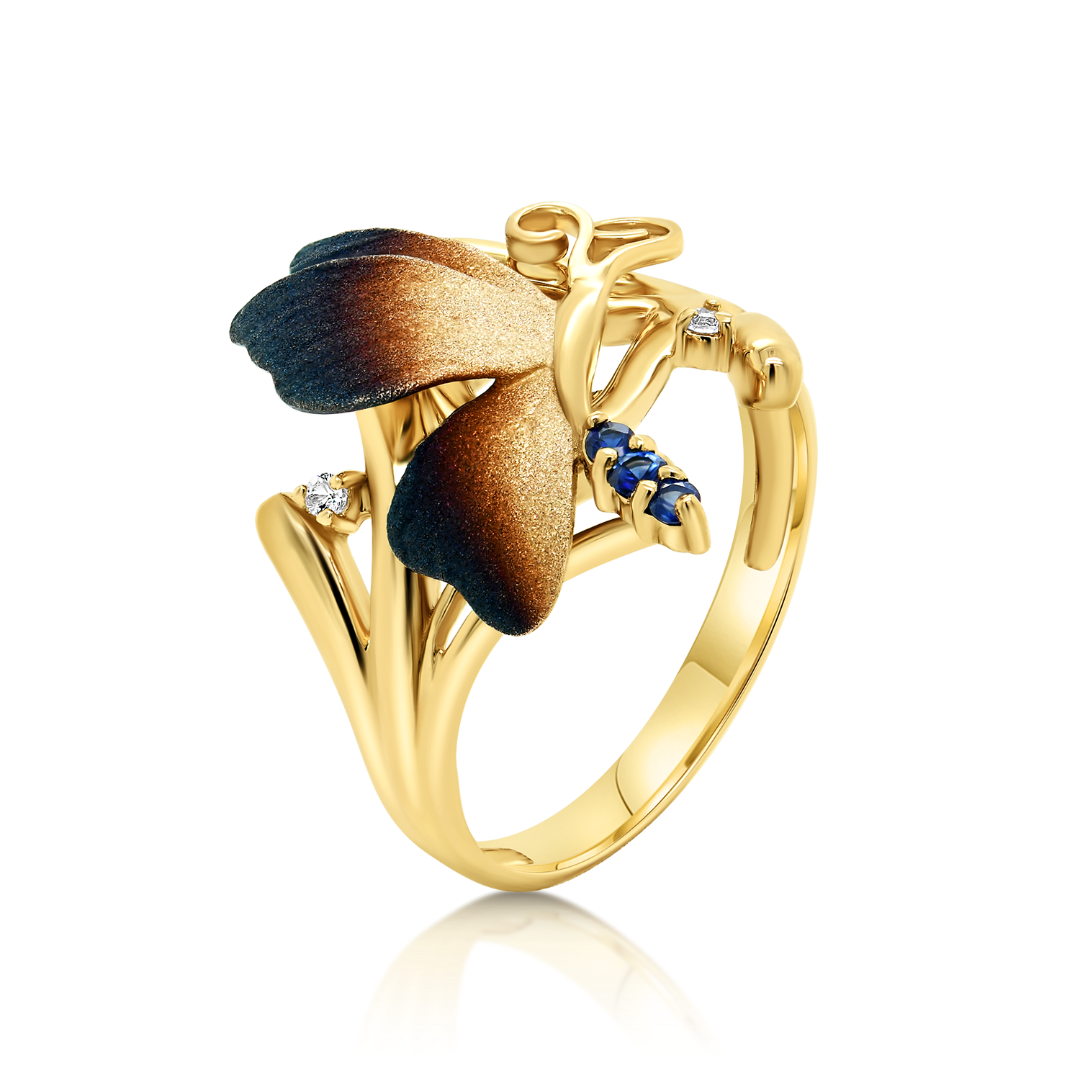 Inel cu efect sidefat din aur galben de 14K, cu Safire albastre și incolore naturale.