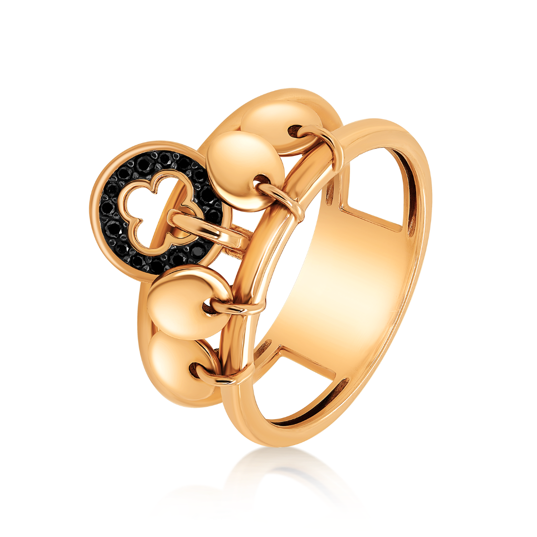 Inel din aur roz de 14K, cu elemente geometrice și pietre cubic zirconia negre.