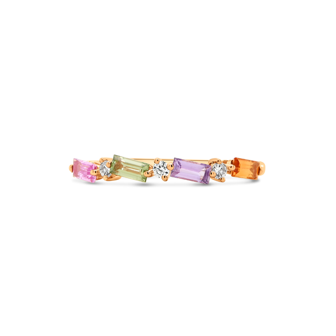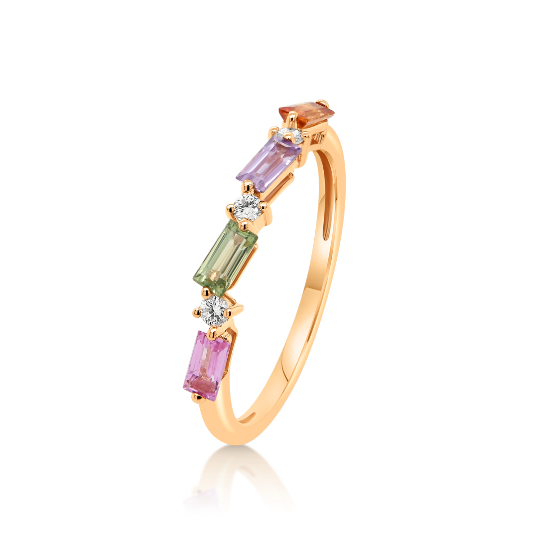 Inel din aur roz de 18K, cu 3 Diamante naturale de 0.067ct și 4 Safire Fancy cu o greutate totală de 0.619ct.