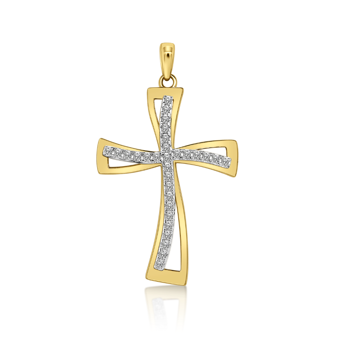 Pandantiv cruce din aur galben de 14K, cu pietre Cubic Zirconia albe.