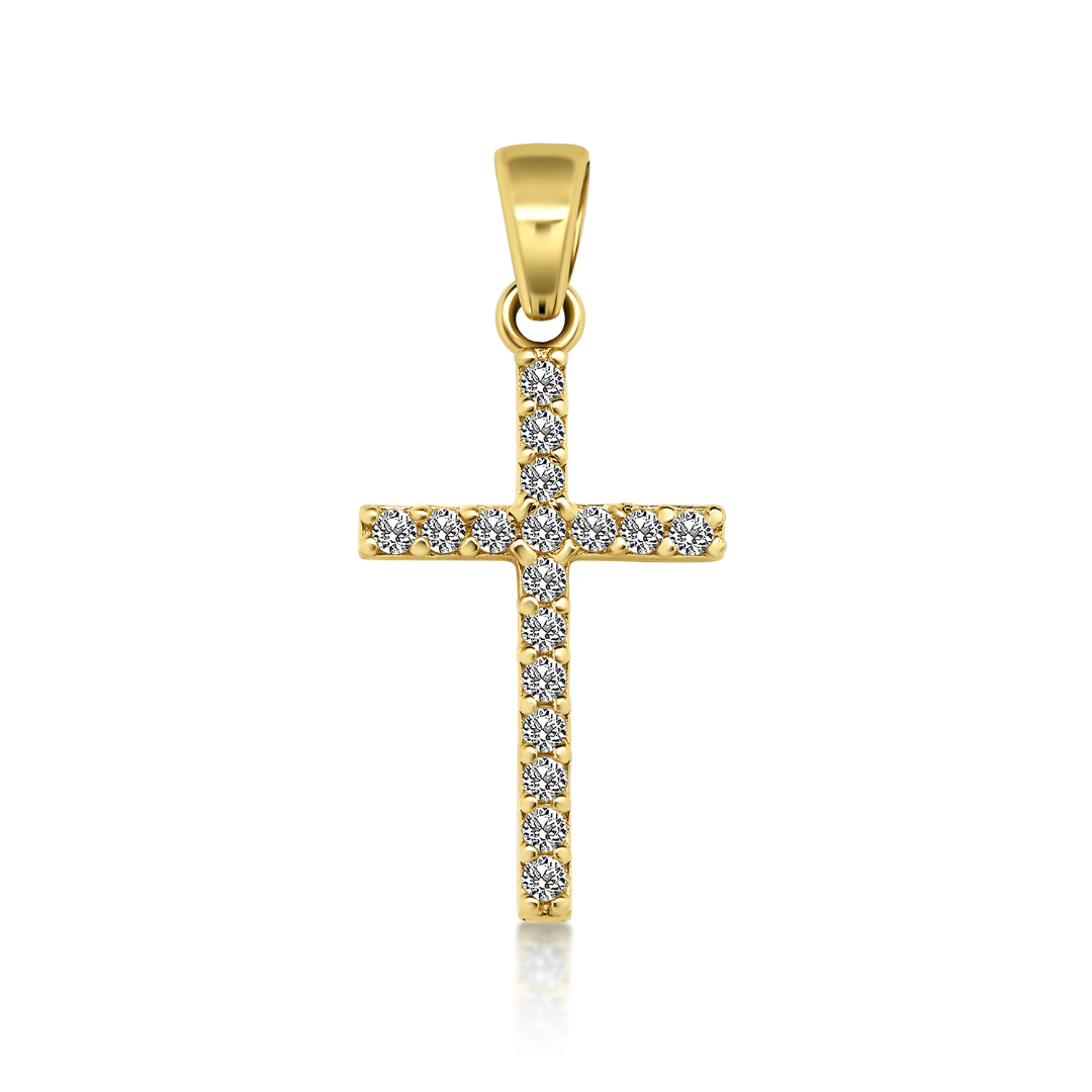 Pandantiv cruce din aur galben de 14K, cu pietre Cubic Zirconia albe.