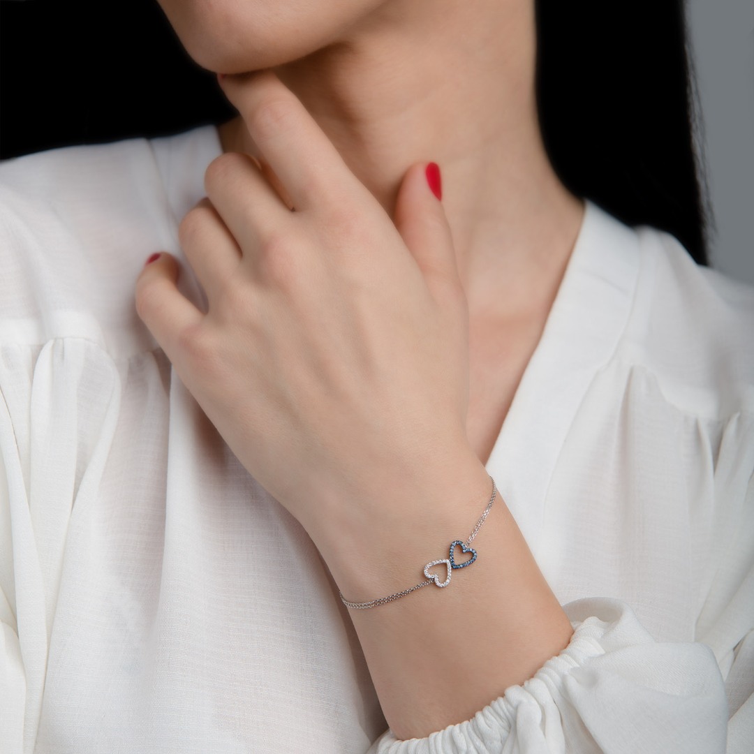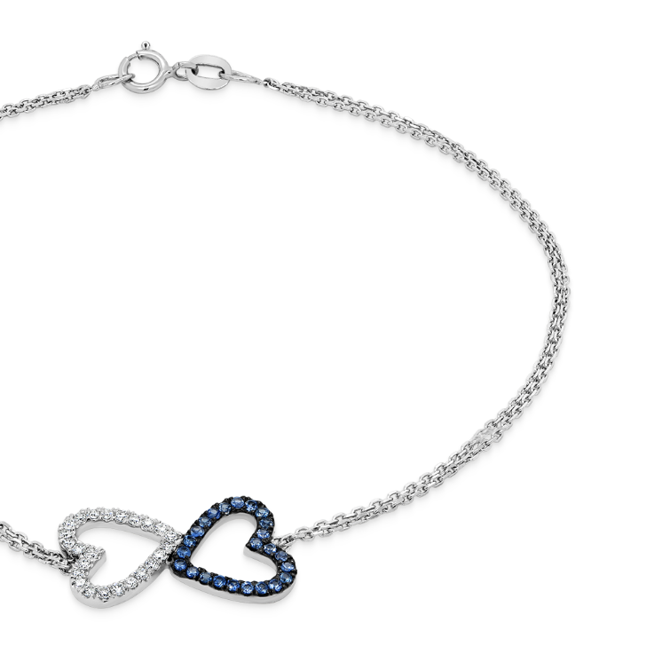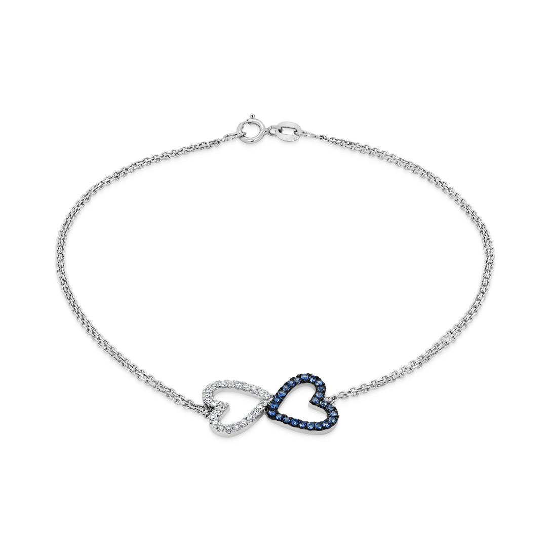 Brățară cu lanț dublu din aur alb de 18K și elemente în formă de inimă încrustat cu Safire și Diamante naturale.