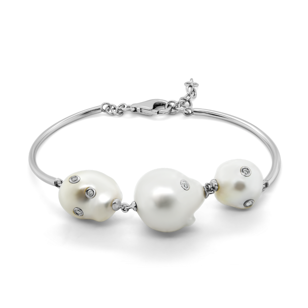 Brățară fixă din aur alb de 18K, cu Perle naturale și Diamante de 0.12ct.