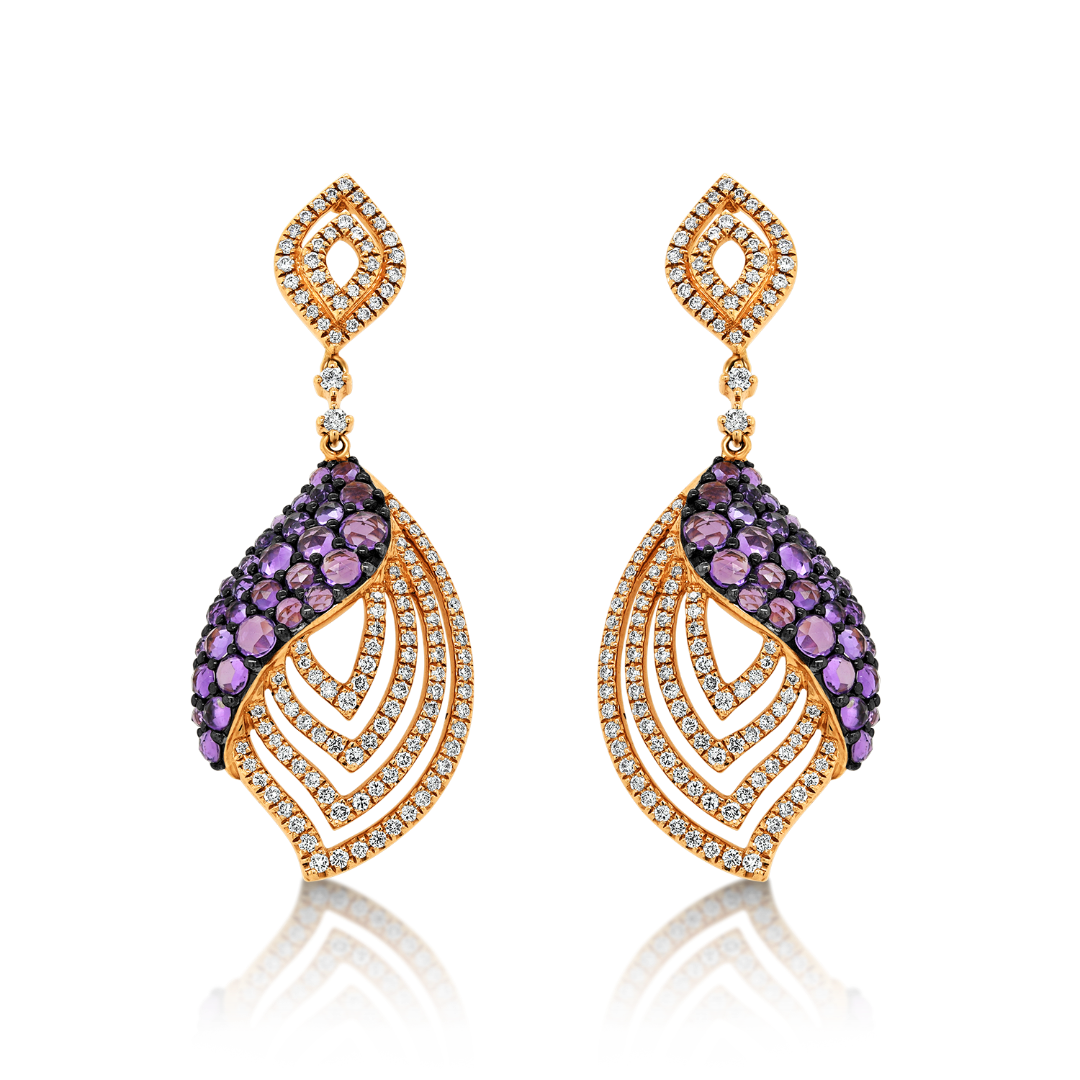 Cercei din aur roz de 18K cu 240 de Diamante naturale de 0.90ct. si 64 de Ametiste de 1.74ct.