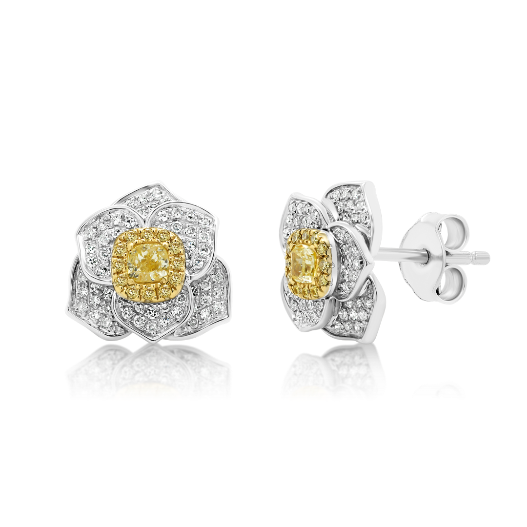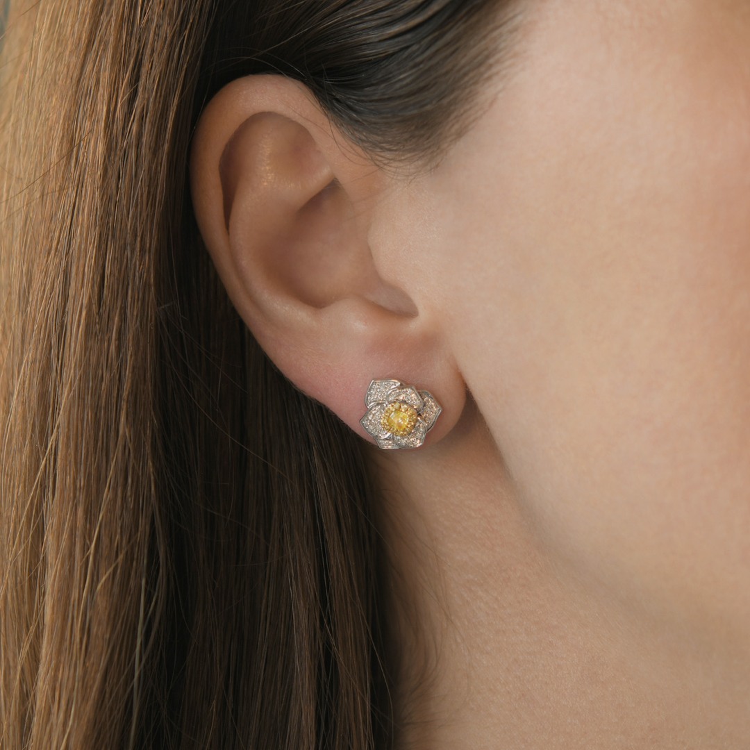 Cercei în formă de floare, din aur alb de 18K cu Diamante naturale incolore și Fancy.