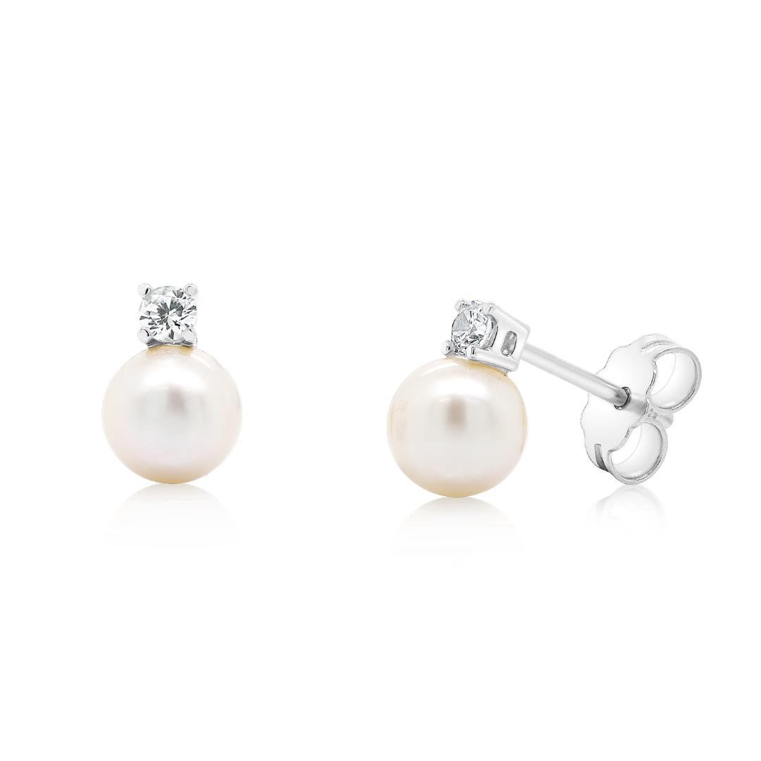 Cercei din aur alb de 18K, cu două Diamante Round Brilliant de 0.04ct și Perle de cultură.