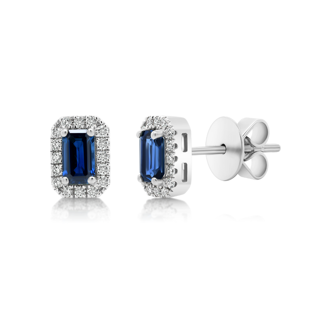 Cercei din aur alb de 18K, cu două Safire albastre de 0.696ct și Diamante Brilliant cut de 0.152ct.