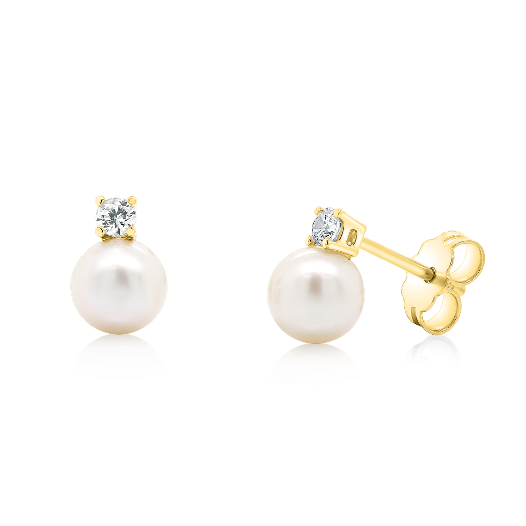 Cercei din aur galben de 18K, cu două Diamante Round Brilliant de 0.04ct și Perle de cultură.